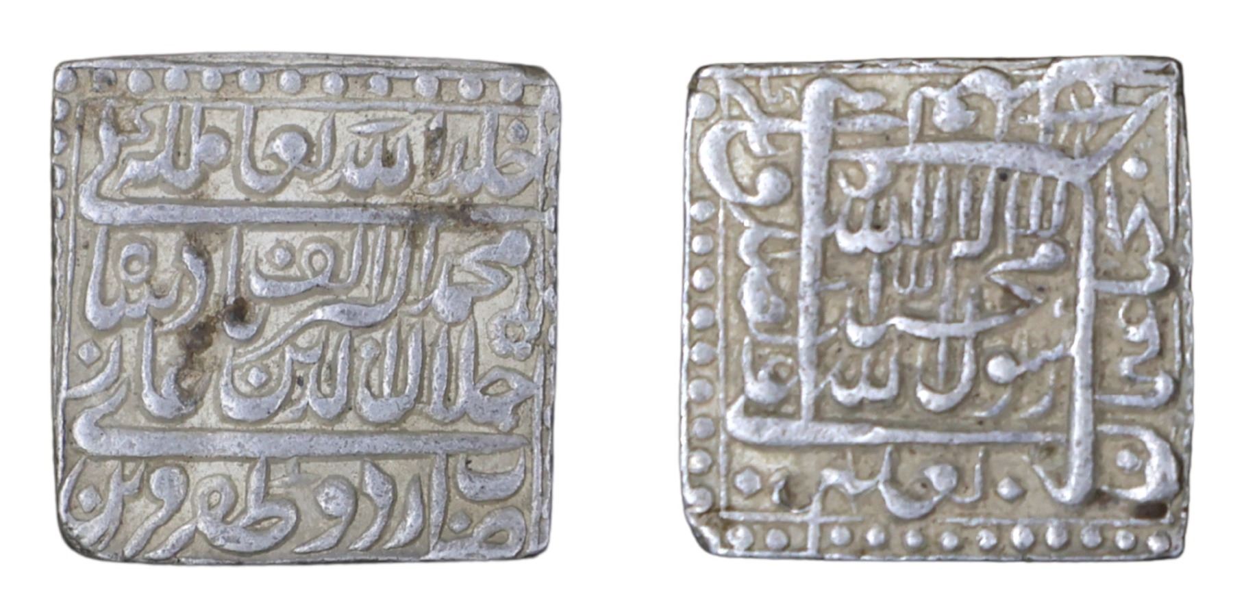 Akbar (AH 963-1014 / 1556-1605 AD), Silver Square Rupee, 11.40g, 21.60x21.90mm, Urdu Zafar Qarin Mint, AH Alif (1000), Kalima type, both side dotted border, complete die impression on both side, wide flan. (KM # 82.8). Extremely Fine.