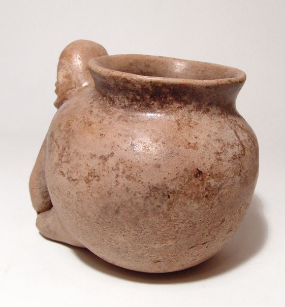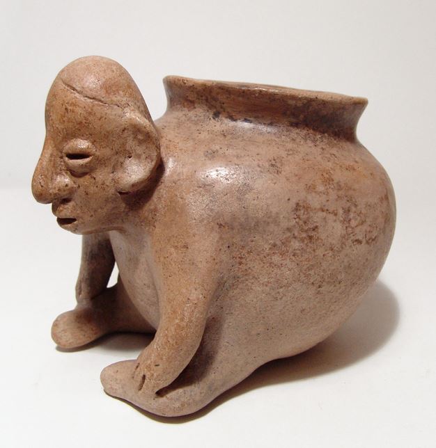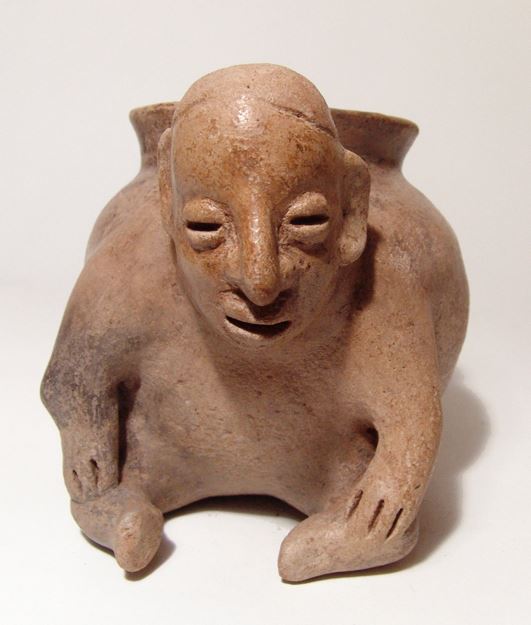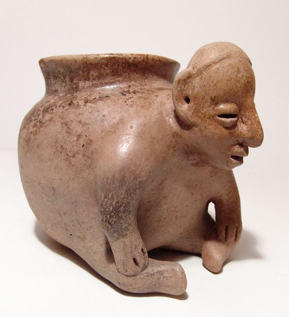 A Jalisco Ameca style sitting figure effigy vessel, West Mexico, c. 200 BC - AD 200, in the form of a man, his features exquisitely modeled and quite expressive. Areas of nicely burnished surface remain, the crème slip with scattered mineral deposits. 5 in x 6 in. Intact. Ex Dr. John Hilsabeck estate, Orange County.