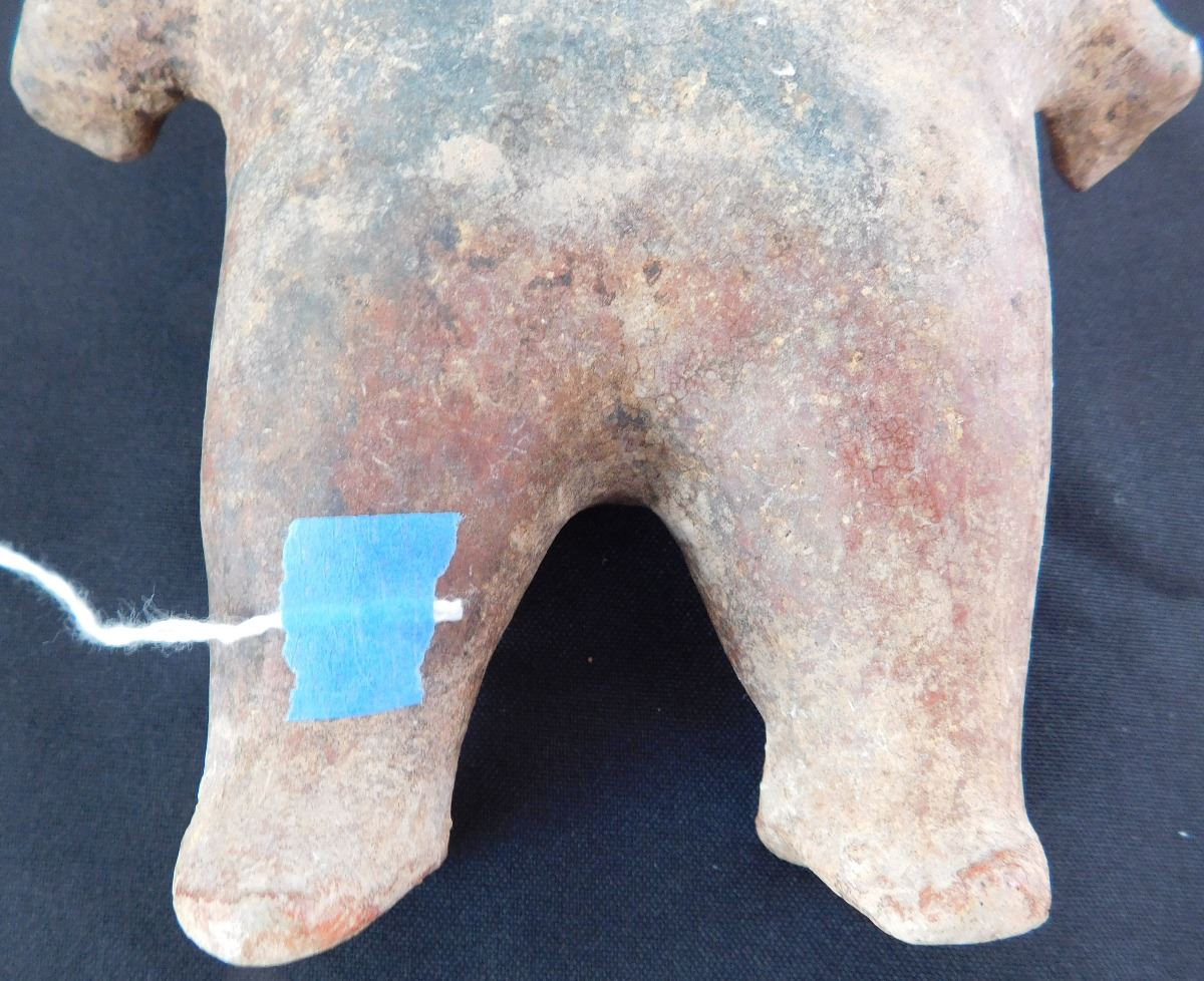 Jalisco Female Pre-Columbian Figure, circa 600 AD. Made of terra cotta and measuring 8" x 5" x 3". From the Mexican state of Jalisco, valley of Mexico. Mineralization throughout item. Condition: Nose has chips, mineralization, see images. Shipping: $18.50.