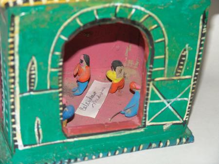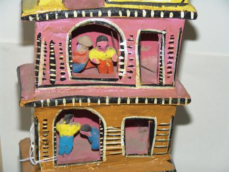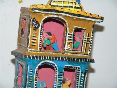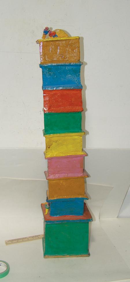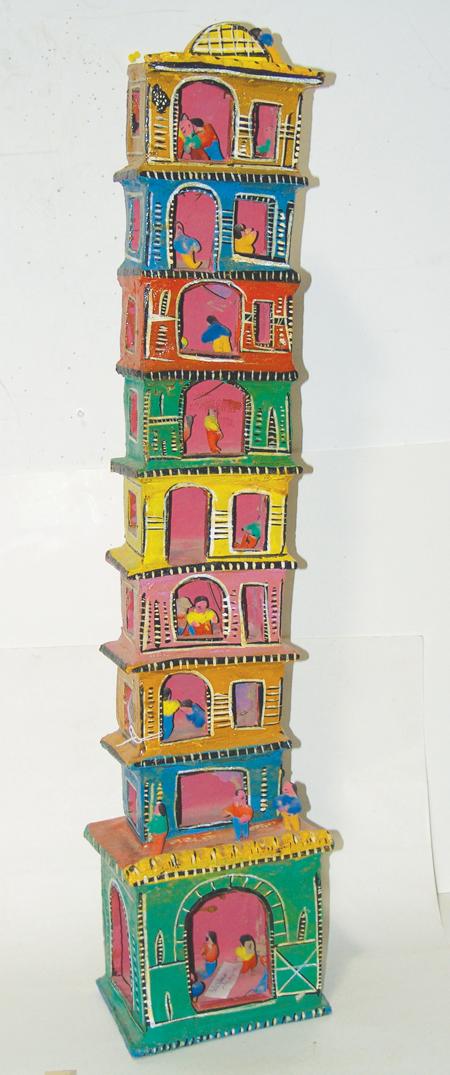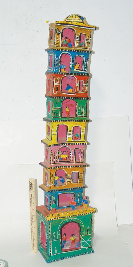Rare 9 story hand formed clay tower filled with human figures. Condition: good. 37" x 8"