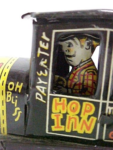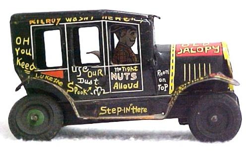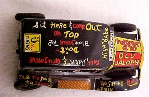 Jalopy; tin wind-up toy; Marx Line Toys Japan; 5" across; missing one side bumper; some minor paint wear.