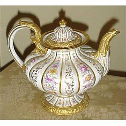 Signed Meissen jam jar. Attached curled platter. Topped with a moulded pink rose bud. Circa 1900.