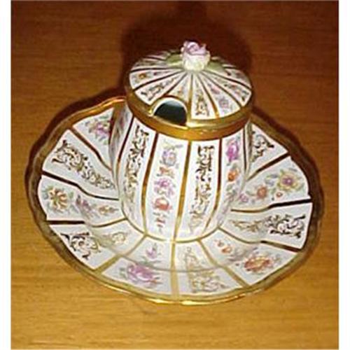 Signed Meissen jam jar. Attached curled platter. Topped with a moulded pink rose bud. Circa 1900.
