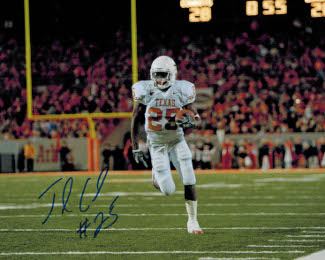 With the 2007 Texas Longhorn football team, Jamaal Charles rushed for over 1,400 yards, with an average of more than six yards per carry. On October 28, 2007, Charles rushed for 290 yards, the most ever against the Nebraska Cornhuskers and the fourth-highest total in Texas Longhorns history. His 216 yards in the fourth quarter were just six shy of the NCAA record for a single quarter. Despite skipping his senior year, Charles ranks fourth in the list of total-rushing yards by a UT player. Jamaal Charles has hand autographed this Texas Longhorns 8x10 Horizontal Photo. Schwartz Sports Hologram and Certificate of Authenticity from Athlon Sports.