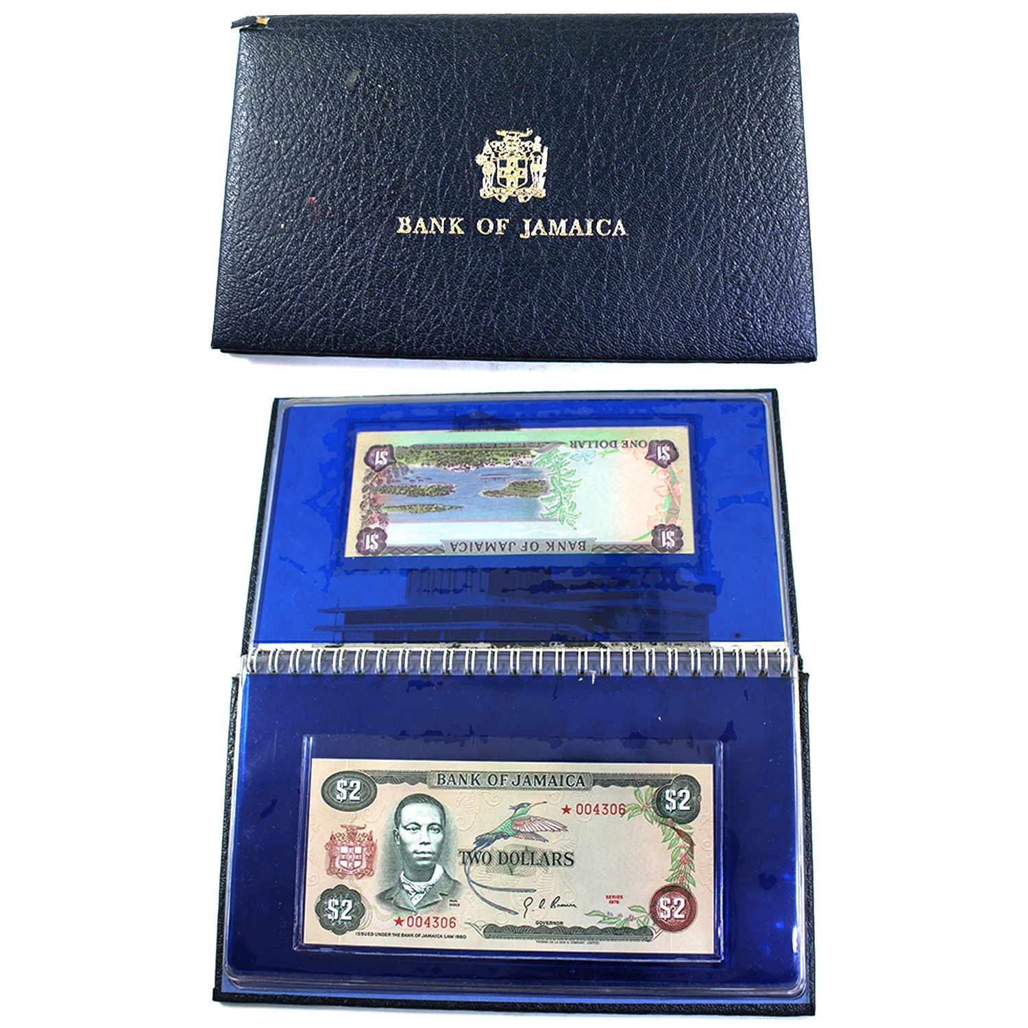 Jamaica 1976 4-Piece Banknote Collector's. 1x Each $1 $2, $5, $10 Designations. Notes Legal Currency w The Following Added Embellishments: Red SN, Star Prefix, & "Series 1976". Wear to outer case. 4306/5000