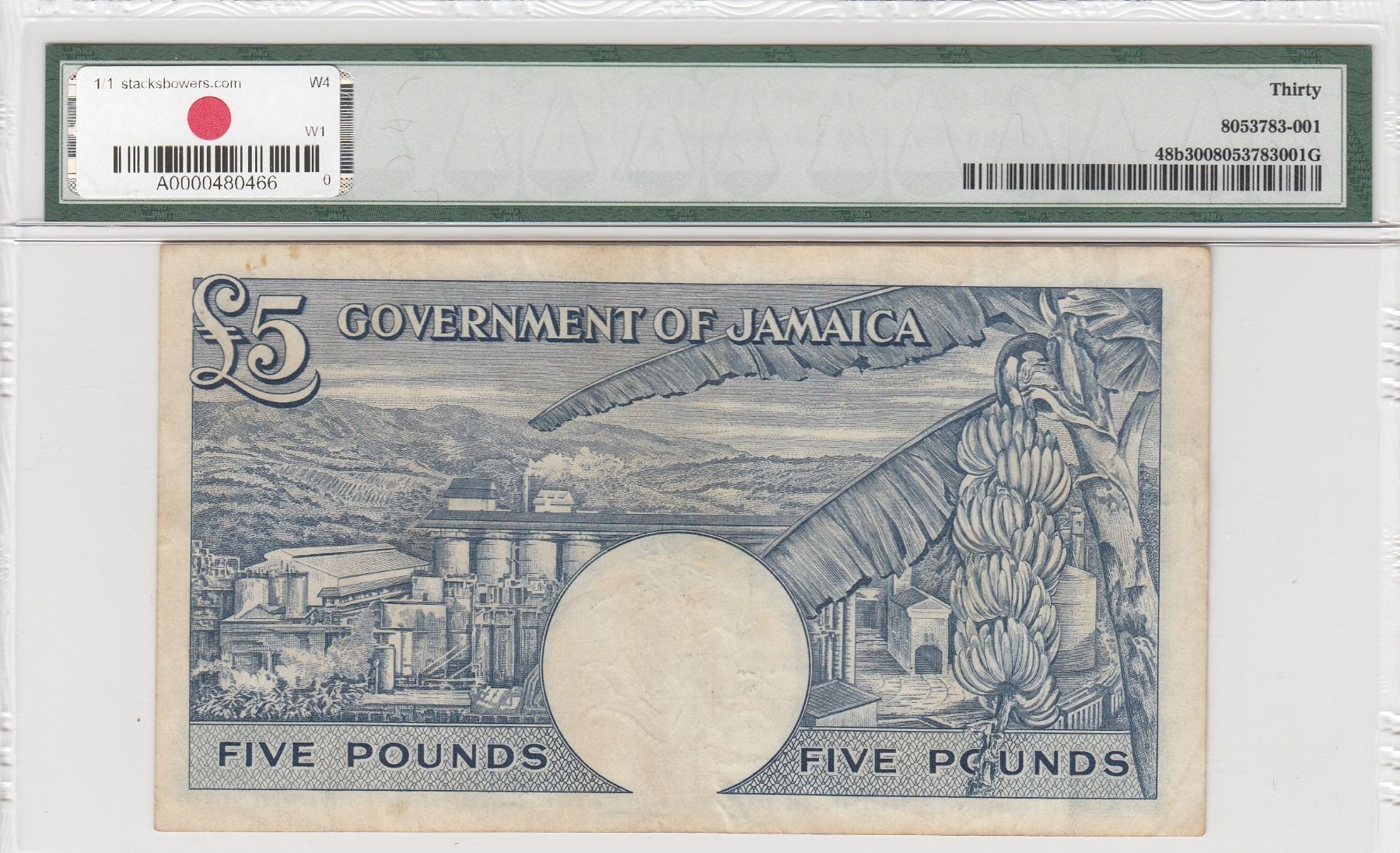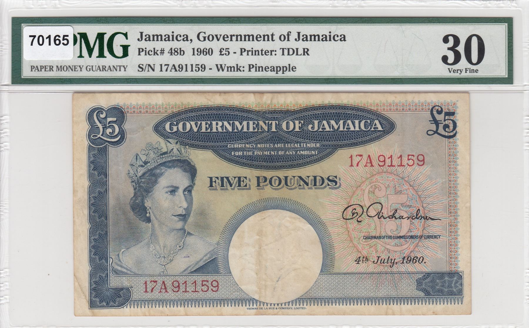Jamaica, 5 Pounds, 1960, VF, p48bbr/PMG 30, Queen Elizabeth II portrait, serial number: 17A 91159