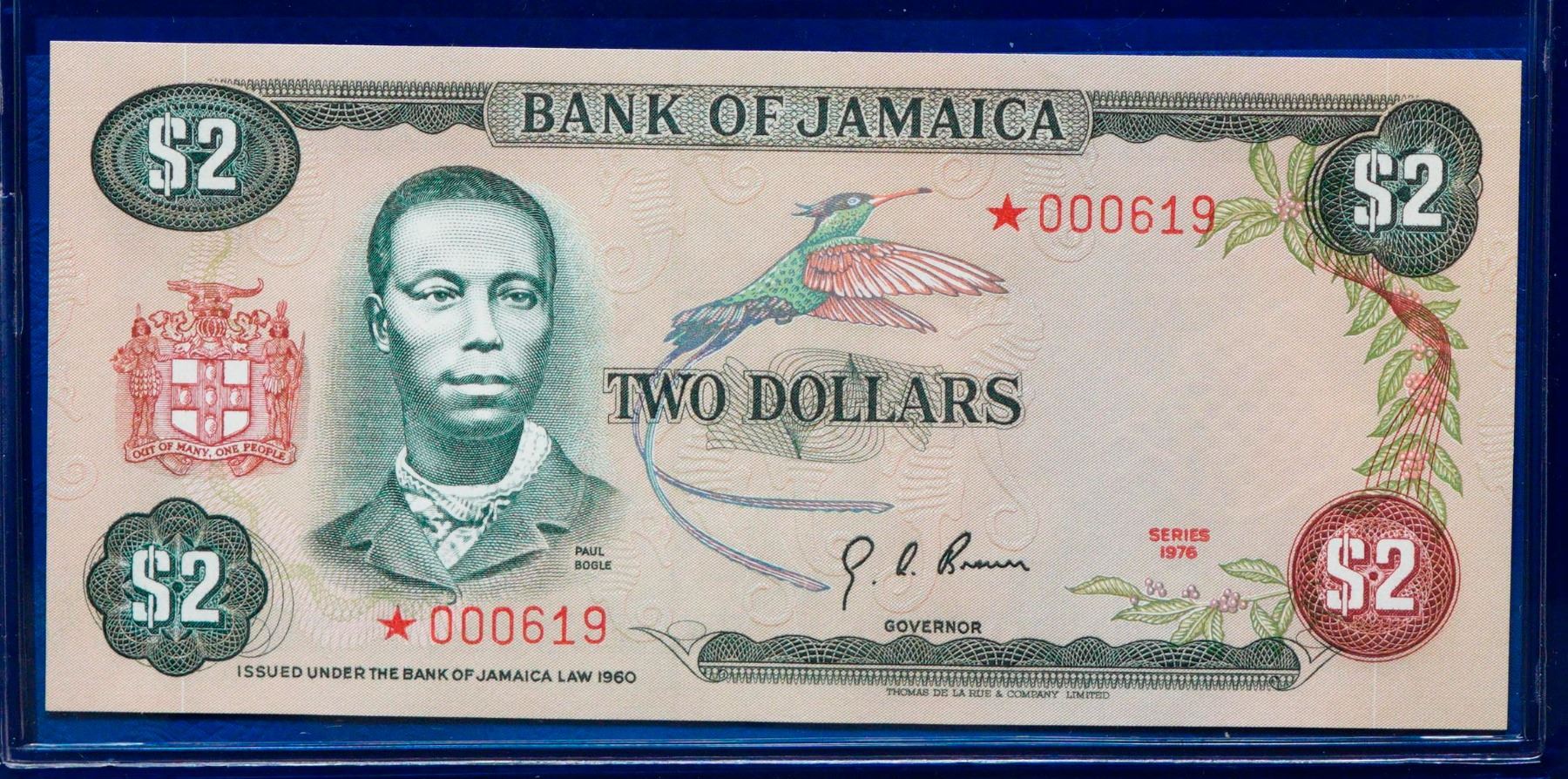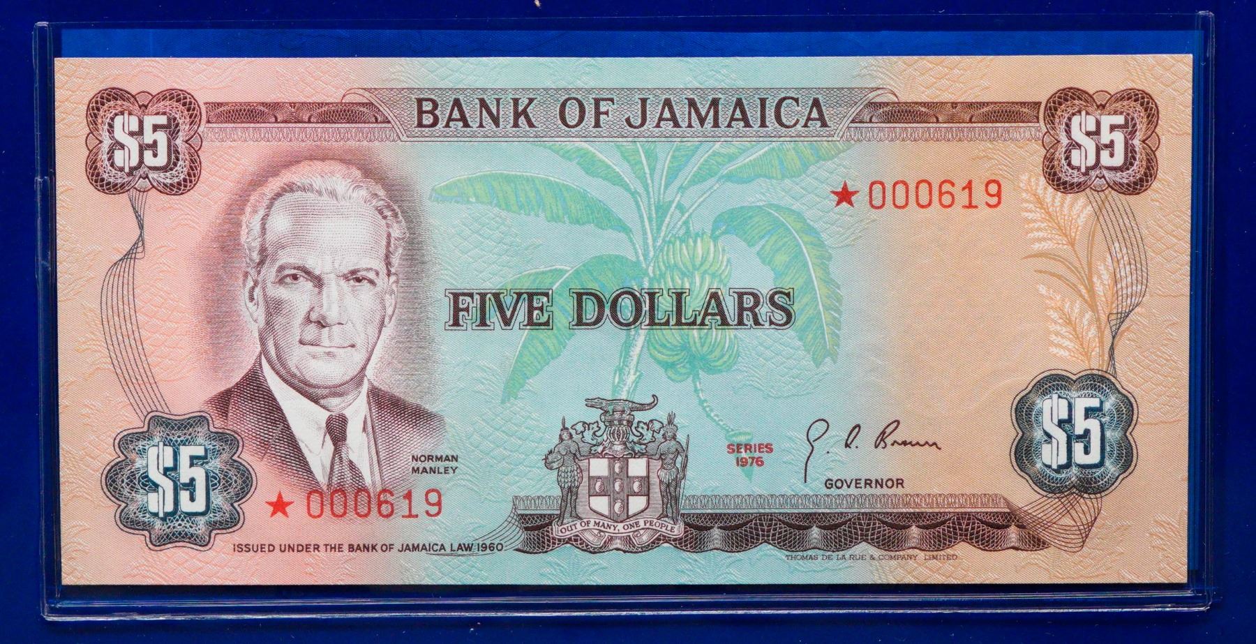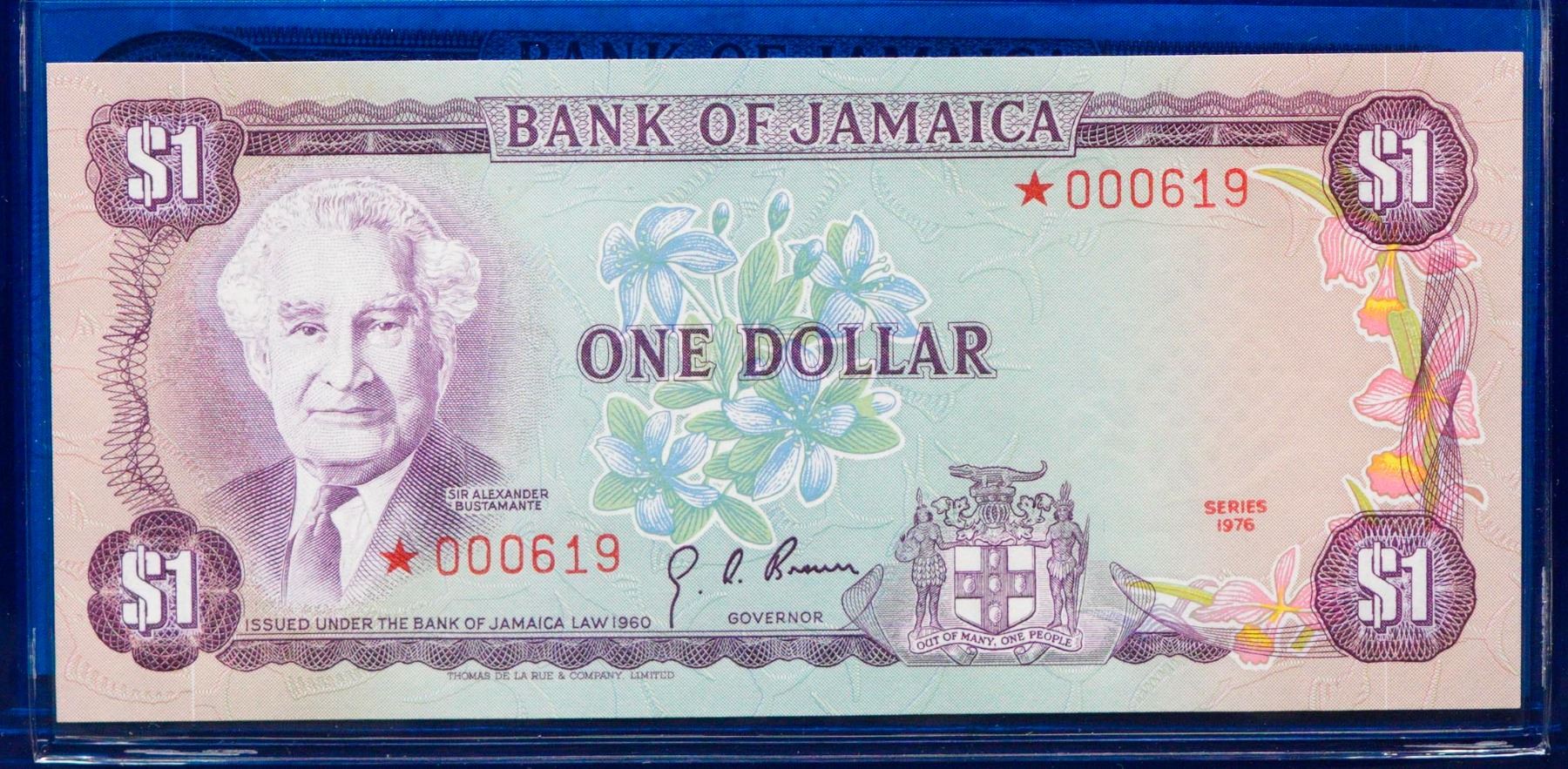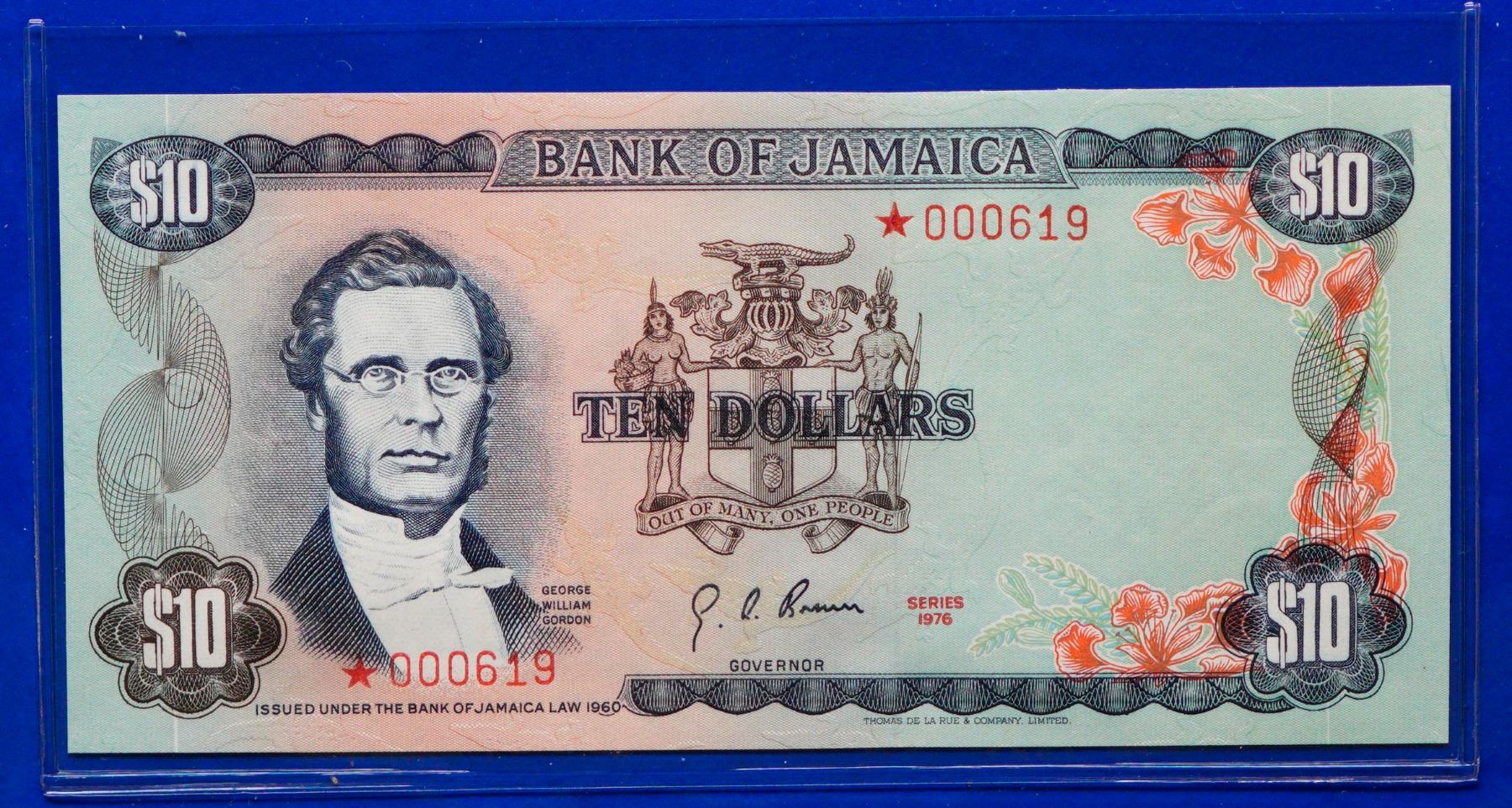 Jamaica; Bank of Jamaica #619 - Banknote Set 1976 $1 to $10 Low Serial Star note Series in blue binder type holder.