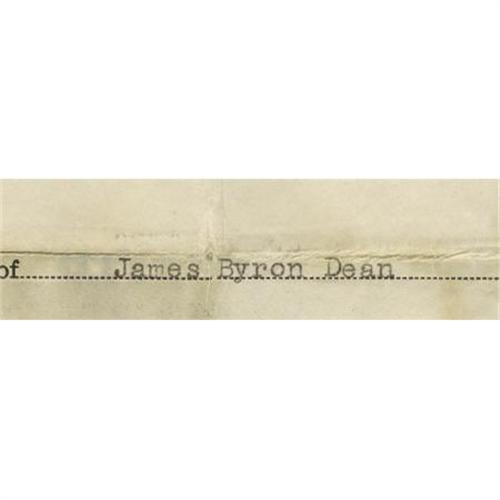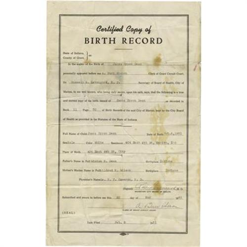 <B>Certified Copy Of James Dean's Birth Record.</B></I> This certified copy of James Dean's 1931 birth certificate was issued May 22, 1945 for school purposes. James went to Fairmount School in Indiana while F. Stanton Galey was the Superintendent of Schools. This birth certificate was found in a drawer of a piece of furniture owned by Mr. Galey. In Good condition, it has surface wear, staining along the right side and moderate corner damage. There are multiple fold creases that have resulted in several pin holes along the fold lines and minor wear rips where the fold meet the edge.<B>Condition Report:</B> In Good condition, it has surface wear, staining along the right side and moderate corner damage. There are multiple fold creases that have resulted in several pin holes along the fold lines and minor wear rips where the fold meet the edge .<BR><BR><b>Shipping:</b> Flat Material, Small (<a target="_blank" href="http://www.heritageauctions.com/common/shipping.php">view shipping information</a>)