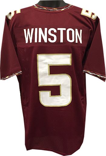 This is a new, in stock, Jameis Winston unsigned garnet unlicensed custom jersey with fully stitched twill numbers on the front and back and players name plate, there are NO LOGOS, TAGS, BRAND NAMES or PATCHES ON THIS JERSEY & IS NOT A OFFICAL LICENSED JERSEY, 100% polyester. This is perfect for autographs, to wear or as a collectible. Size XL (48/50)