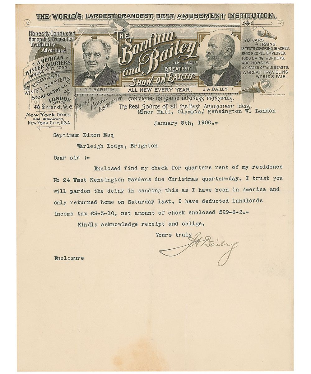 American showman (1847–1906) best known as a partner in Barnum and Bailey’s circus. TLS signed “J. A. Bailey,” one page, 8.25 x 11, ornate, information-laden, and visually striking Barnum and Bailey Greatest Show on Earth letterhead, January 8, 1900. Letter to his landlord. In part: “Enclosed please find my check for quarters rent of my residence No 24 West Kensington Gardens…I trust you will pardon the delay in sending this as I have been in America and only returned home on Saturday last.” Intersecting folds, one through a single letter of signature, a few creases, and some light toning to bottom edge, otherwise fine condition.