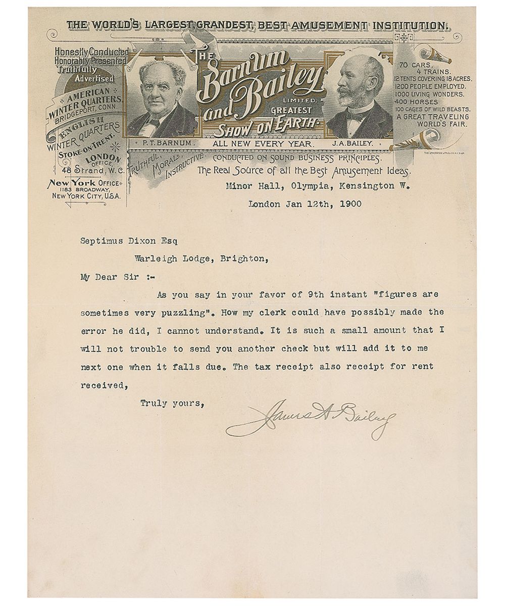 American showman (1847–1906) best known as a partner in Barnum and Bailey’s circus. TLS signed “James A. Bailey,” one page, 8.25 x 10.75, ornate, information-laden, and visually striking Barnum and Bailey Greatest Show on Earth letterhead, January 12, 1900. Letter to Septimus Dixon. In part: “As you say in your favor of 9th instant ‘figures are sometimes very puzzling.’ How my clerk could have possibly made the error he did, I cannot understand. It is such a small amount that I will not trouble to send you another check but will add it to me [sic] next one when it falls due.” In fine condition, with intersecting folds (two vertical folds passing through letters of the signature), and a few light creases. In addition to the stunning letterhead, this features Bailey’s uncommon full signature—he generally signed using only his initials.