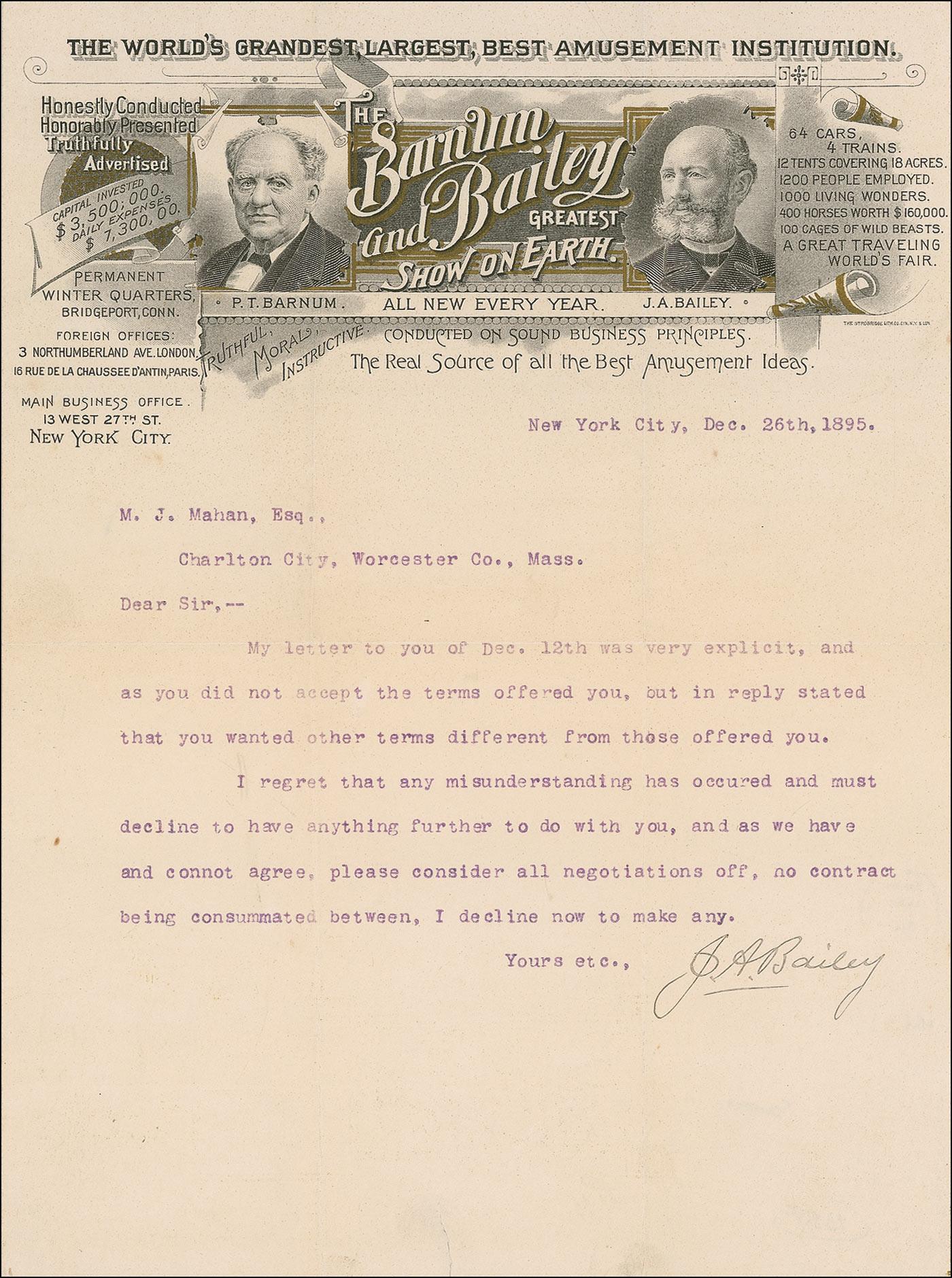 TLS signed “J. A. Bailey,” one page, 8.25 x 11, ornate, information-laden, and visually striking Barnum and Bailey Greatest Show On Earth letterhead, December 26, 1895. Letter to M. J. Mahan in Charlton City, Massachusetts. In full: “My letter to you of Dec. 12th was very explicit, and as you did not accept the terms offered you, but in reply stated that you wanted other terms different from those offered you.I regret that any misunderstanding has occurred and must decline to have anything further to do with you, and as we have and cannot agree, please consider all negotiations off, no contract being consummated between, I decline now to make any.” Intersecting folds, and a small tear and creasing to bottom edge, otherwise fine condition. Accompanied by the original Barnum and Bailey mailing envelope, which also bears vignettes of both men. Pre-certified PSA/DNA and RRAuction COA.