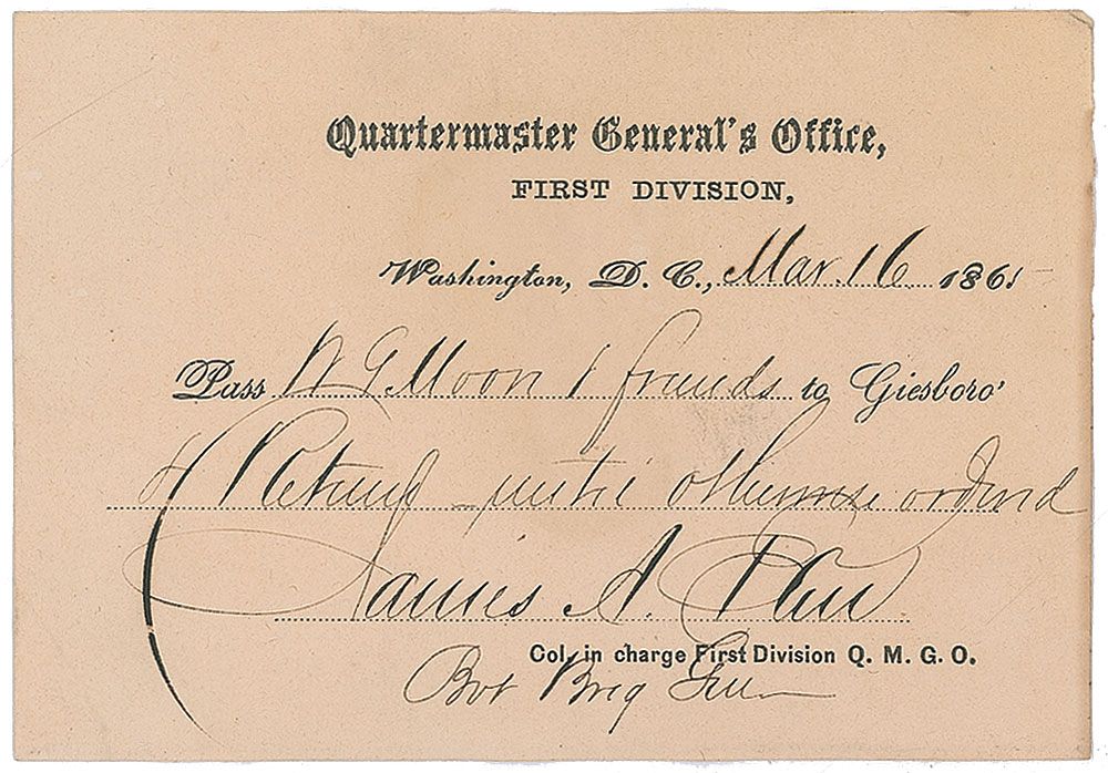 Union general who served as a member of the military commission that tried the conspirators involved with Lincoln’s assassination (1819–1891). Civil War–dated partly-printed pass, signed “James A. Ekin, Bvt. Brig. Gen.,” issued by the Quartermaster General’s Office, 4.25 x 3, Washington, DC, March 16, 1865. In full: “Pass W. G. Moon & friends to Giesboro’ & Return, until otherwise ordered.” Light overall toning and some light rippling due to adhesive remnants to reverse, otherwise fine condition.