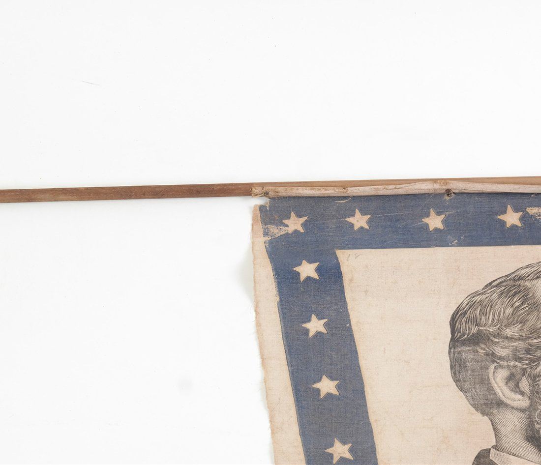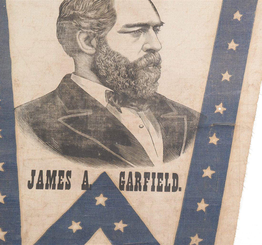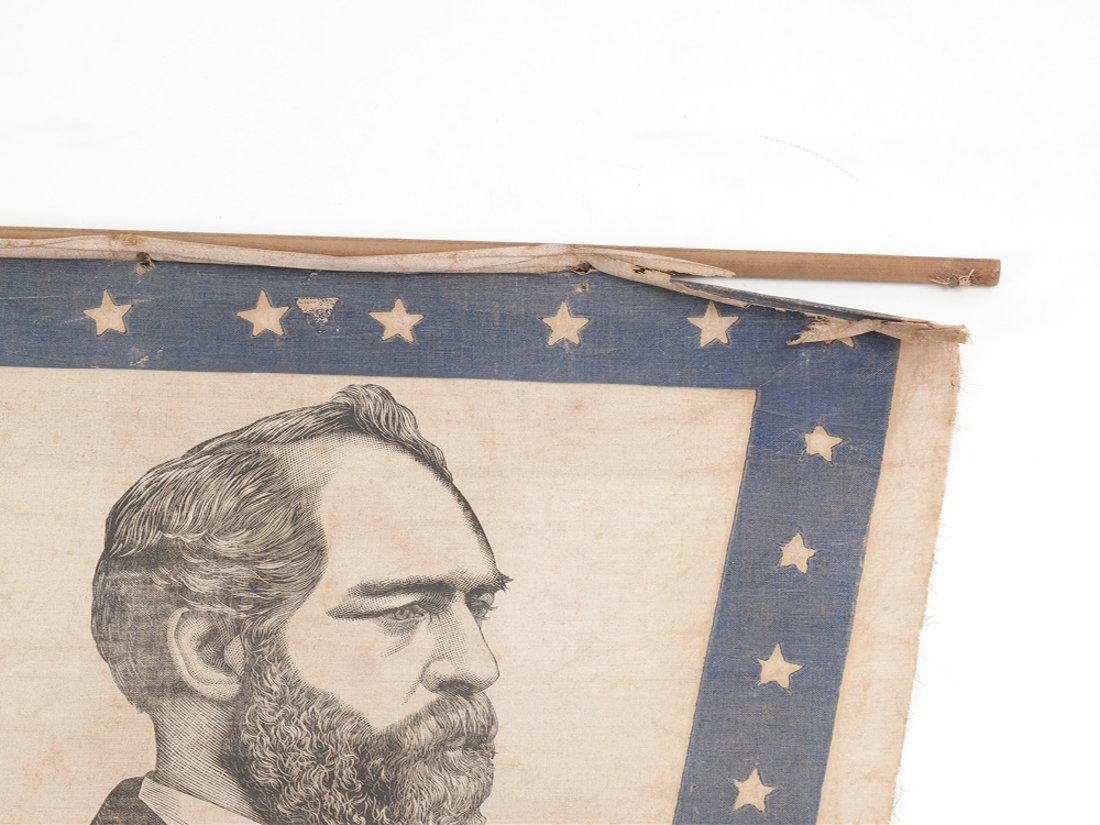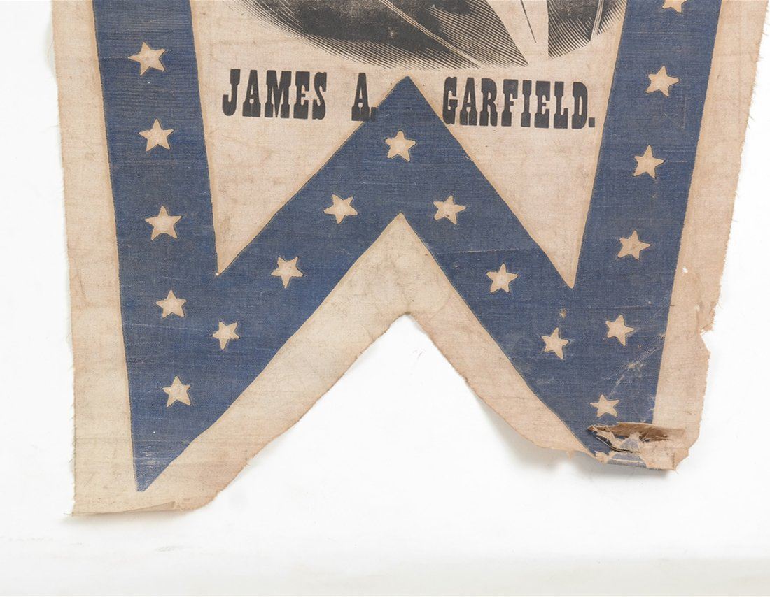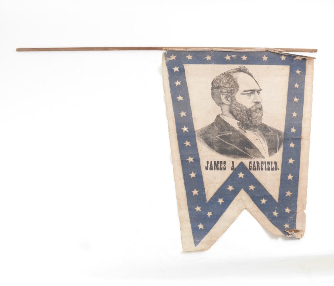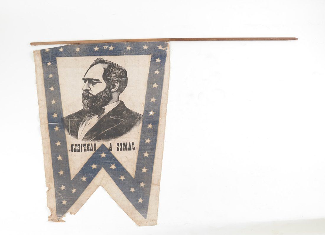 Bears 3/4 profile depiction of Garfield surrounded by wide blue border with stars. Nailed to the original stick.