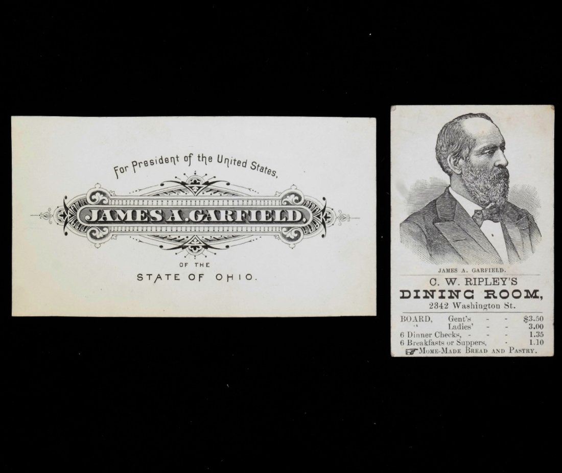 Comprises: 1.) "Garfield's Implacable Hatred of the Southern People! / Glance at a Dark Record," small four page 4to pamphlet, R.O. Polkinhorn, Washington, D.C., circa 1880. 2.) "Reasons Why Workingmen Should Vote For Garfield and Arthur," double-sided [one side in English, the other in German] oblong 16mo on blue card stock. Contains warnings about the Democrats promise of reducing the import duties upon common goods coming from Europe. 3.) "United States Government Church," two page 16mo handbill on pink paper. Contains a pro-Spritualist, and semi incoherent, attack upon "The United States Church of Women." Named enemies are Grant, Hayes, and Garfield. 4.) Engraved 32mo card imprinted "For President of the United States. / James A. Garfield. / Of the State of Ohio." 5.) Printed boarding house advertising card issued by "C.W. Ripley's Dining Room." Bears a portrait of Garfield.