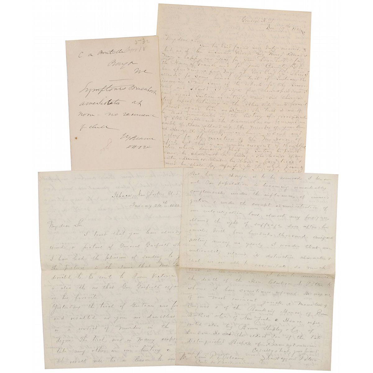 Three letters concerning the assassination of President Garfield, including one by his secretary of state, James G. Blaine, written the day before his death. First, an ALS signed “J. G. Blaine,” one page, April 18, [1881], in full: “Symptoms somewhat ameliorated at noon. No recurrence of chill.” The two additional letters are by Ziba Hazzard Potter, totaling ten pages, dated December 1881 and January 1882, and concern the trial of Charles Guiteau. The earlier letter, in part: “I attended for some hours the trial of Guiteau, the assassin. I met some of the experts for the Governments, and should I judge from their opinions I would regard Guiteau as entirely sane. But there is strong expert testimony on the other side and from it I should regard him as insane. The trial is one of the most remarkable in the history of governments and of state trials.” The later letter, in part: “Yesterday the trial of Guiteau was finished and resulted…in a verdict of murder in the first degree…I hope the result will be a lesson to assassins in both hemispheres.” In overall fine condition, with expected folds, light stains, and toning.