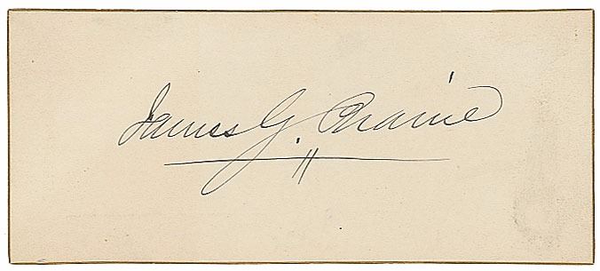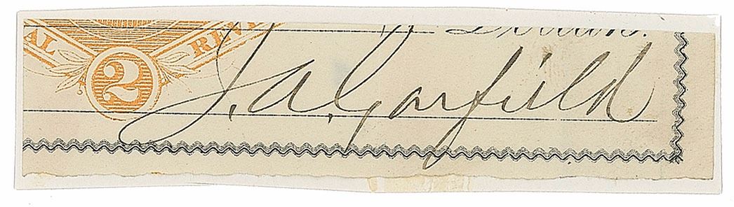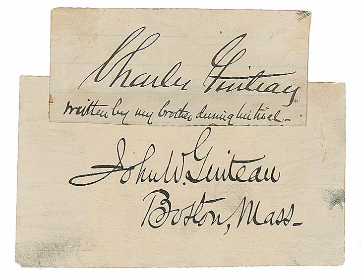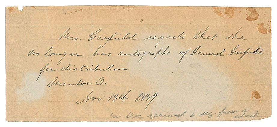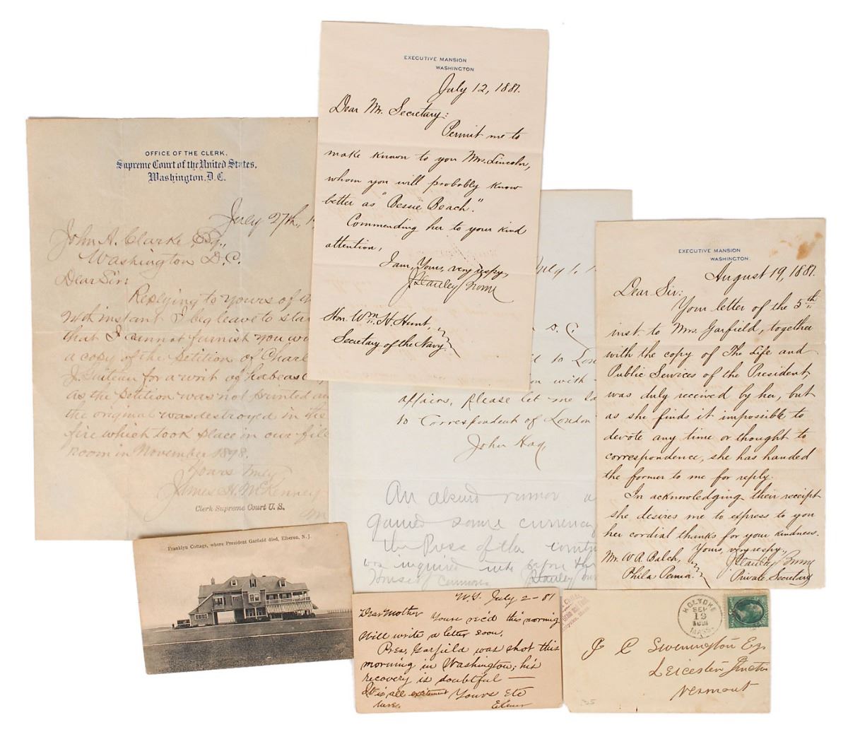 Collection of eleven items related to President Garfield and his assassination, with highlights including: an ink signature, “J. A. Garfield,” on a slip clipped from a check; an ink signature, “Charles Guiteau,” on an off-white slip affixed to a card also signed by his brother, “Written by my brother during his trial, John W. Guiteau, Boston, Mass”; a third-person ANS by First Lady Lucretia Garfield, November 13, 1889, in full: “Mrs. Garfield regrets that she no longer has autographs of General Garfield for distribution”; an ink signature, “James G. Blaine,” on an off-white card. Other items include: a manuscript telegram to Secretary of State James G. Blaine dictated by John Hay, July 1, 1881, the day on which Charles Guiteau followed President Garfield to Blaine’s house and pondered his assassination; a postcard by a citizen of New York, dated July 2, 1881, in part: “Pres. Garfield was shot this morning in Washington; his recovery is doubtful”; a letter by Garfield’s personal secretary J. Stanley Brown on Executive Mansion letterhead, July 12, 1881, introducing a lady to his Secretary of the Navy William H. Hunt, who was waiting for Garfield to board the train when he was shot; a second letter by Brown on Executive Mansion letterhead, August 19, 1881, thanking his correspondent for a gift of the book The Life and Public Services of the President on behalf of the first lady; a letter by a Supreme Court clerk, one page, July 27, 1903, in part: “I cannot furnish you with a copy of the petition of Charles J. Guiteau for a writ of habeas corpus as the…original was destroyed in a fire”; an otherwise unrelated mailing envelope postmarked on September 19, 1881, the day of Garfield’s death; and a postcard depicting Franklyn Cottage, where Garfield passed away. In overall very good to fine condition.