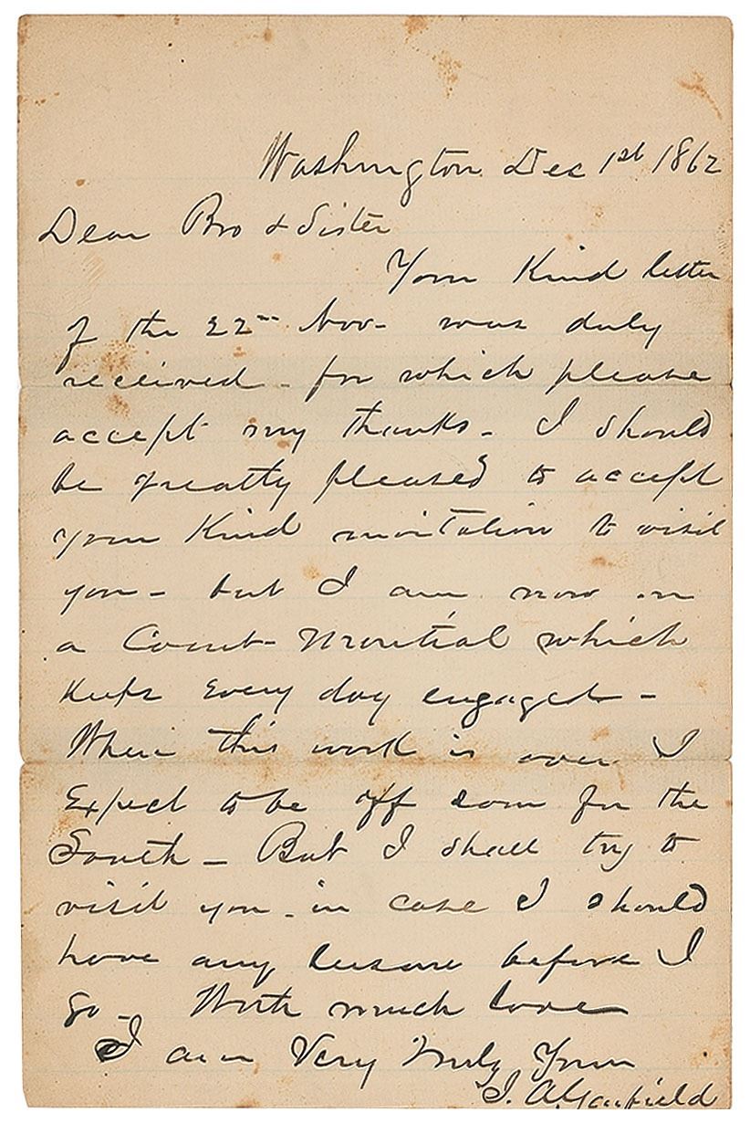 Civil War-dated ALS signed “J. A. Garfield,” one page, 5.25 x 8, December 1, 1862. Letter to his brother and sister, in full: "Your kind letter of the 22nd Nov. was duly received for which please accept my thanks. I should be greatly pleased to accept your kind invitation to visit you, but I am now in a Court Martial which keeps every day engaged. When this work is over, I expect to be off soon for the South. But I shall try to visit you, in case I should have any leisure before I go." In very good to fine condition, with scattered light foxing, and old tape to fold separations on the reverse.