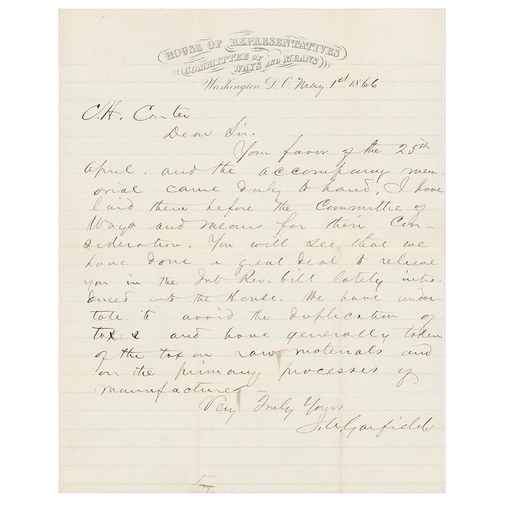 ALS signed “J. A. Garfield,†one page, 7.75 x 9.75, House of Representatives, Committee of Ways and Means letterhead, May 1, 1866. Handwritten letter to C. H. Carter, in full: "Your favor of the 25th April, and the accompanying memorial came duly to hand. I have laid there before the Committee of Ways and Means for their consideration. You will see that we have done a great deal to relieve you in the Int. Rev. bill lately introduced into the House. We have undertaken to avoid the duplication of taxes and have generally taken off the tax on raw materials and on the primary processes of manufacturers." In fine condition.
