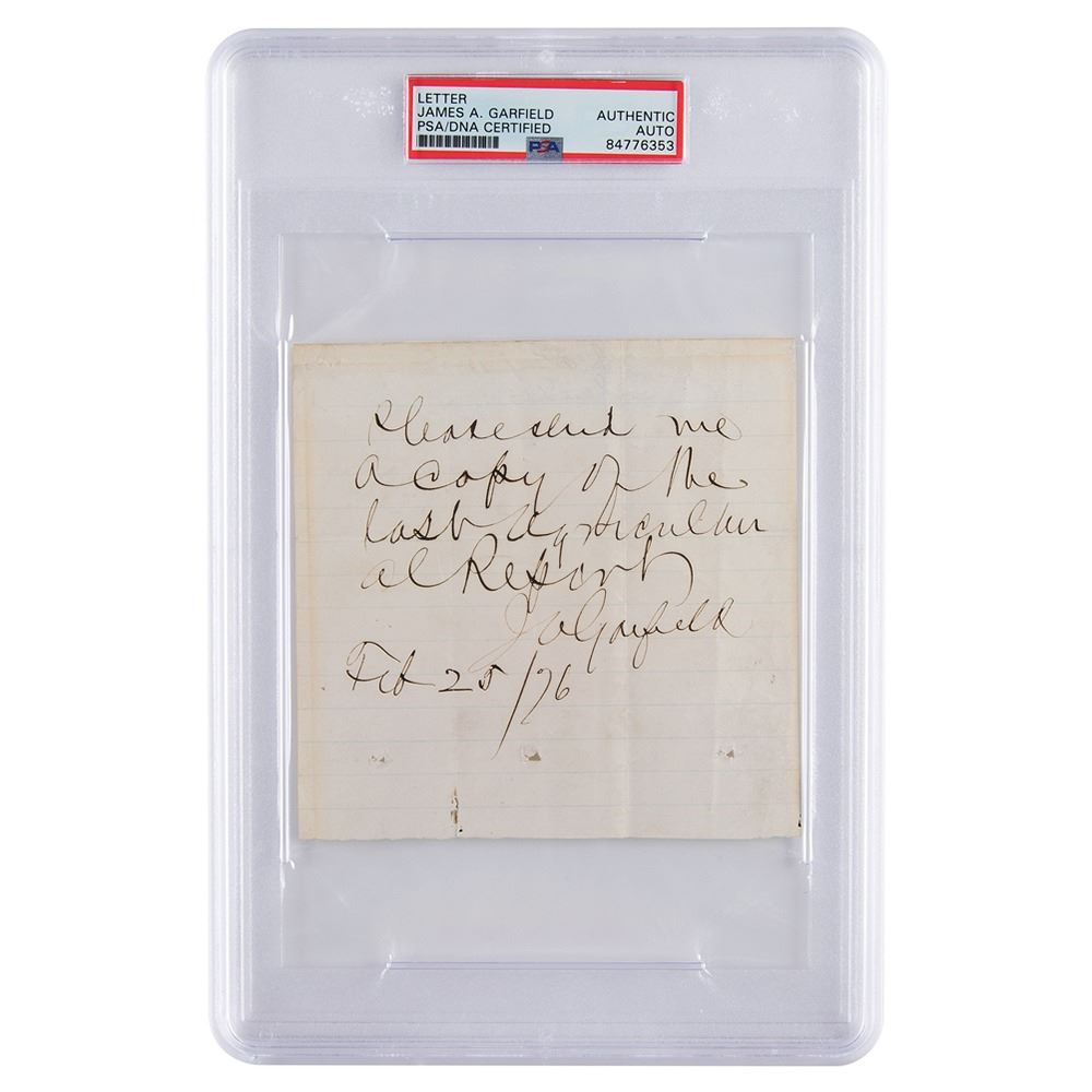 ALS signed & ldquo;J. A. Garfield,& rdquo; one page, 5 x 5, February 25, 1876. Handwritten note, in full: "Please send me a copy of the last Agricultural Report." In fine condition, with light creasing, and a tiny hole to the bottom blank area. Encapsulated in a PSA/DNA authentication holder.