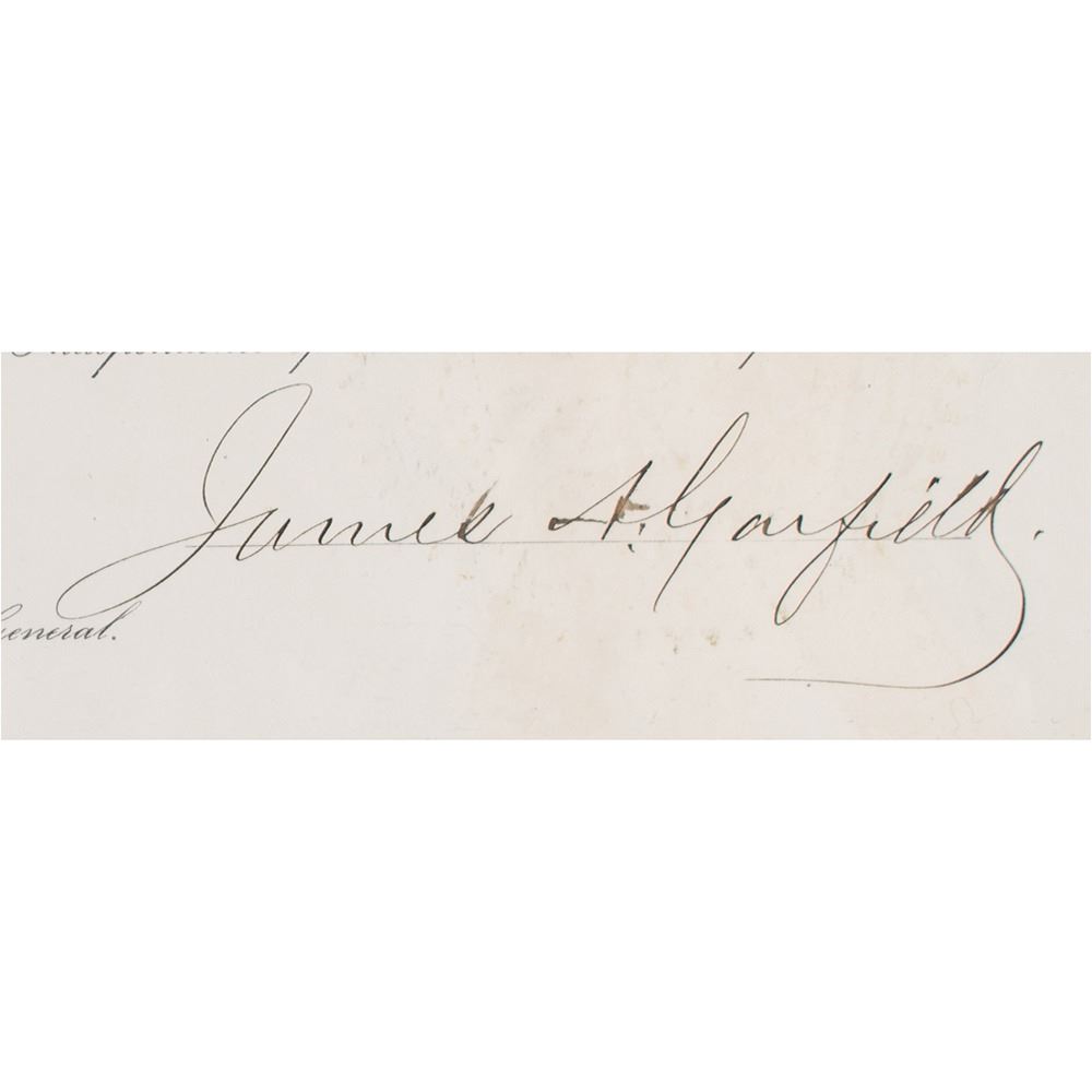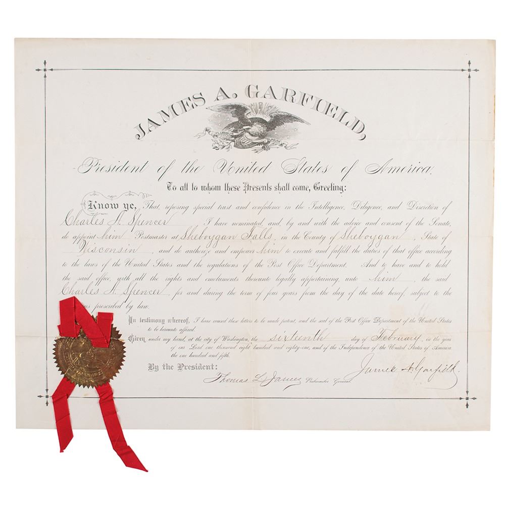 Partly-printed DS as president, one page, 17 x 14, February 16, 1881. President Garfield appoints Charles A. Spencer as "Postmaster at Sheboygan Falls…State of Wisconsin." Signed neatly at the conclusion by James A. Garfield, and countersigned by Postmaster General Thomas L. James. Lower left retains the original gold foil seal with red ribbons. In fine condition, with a slight tear to foil seal. Given his brief time in office, presidential documents issued by Garfield are quite rare, with this particular example all the more unusual in that it was ostensibly filled out in advance, some 16 days before Garfield assumed the presidency. As this commission was essentially waiting for the president, it's not unfair to suppose that this may have been one of the first documents Garfield signed in the White House.