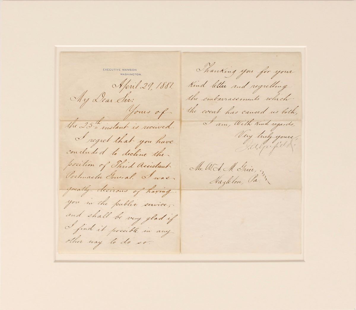 Exceedingly rare LS as president signed “J. A. Garfield,” two pages, 5.5 x 9, Executive Mansion letterhead, April 29, 1881. Letter to W. A. M. Grier of Pennsylvania, in part: “I regret that you have concluded to decline the position of Third Assistant Postmaster General. I was greatly desirous of having you in the public service, and shall be very glad if I find it possible in any other way to do so. Thanking you for your kind letter and regretting the embarrassments which the event has caused us both.” Mounted and matted. In fine condition, with scattered light soiling, and small archival mounting remnants to back top edges. Accompanied by a large engraved portrait bearing a facsimile signature.