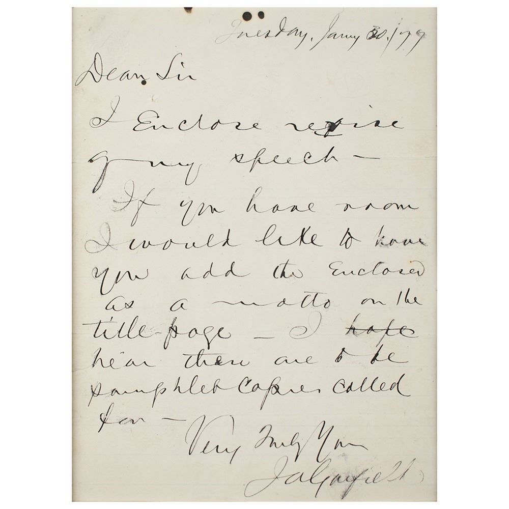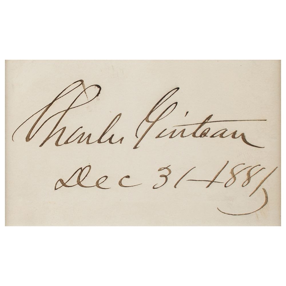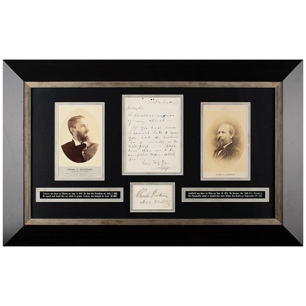 Desirable pairing of an American president and his assassin—an LS as an Ohio congressman, signed “J. A. Garfield,†one page, 4.75 x 6.5, January 30, 1877, in part: “I enclose…of my speech—If you have room I would like to have you add the enclosed as a motto on the title page—I hear there are to be pamphlet copies called forâ€; and an ink signature, “Charles Guiteau, Dec. 31–1881,†penned while incarcerated for the murder of Garfield on an off-white 3.5 x 2 card. Double-matted and framed together with cabinet portraits and engraved plaques to an overall size of 26.5 x 16.5. In overall fine condition, with slight brushing to Garfield's signature.