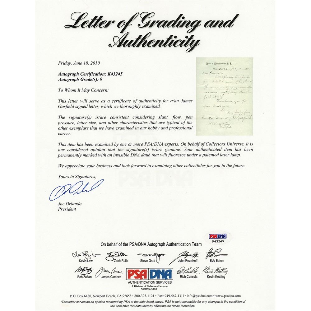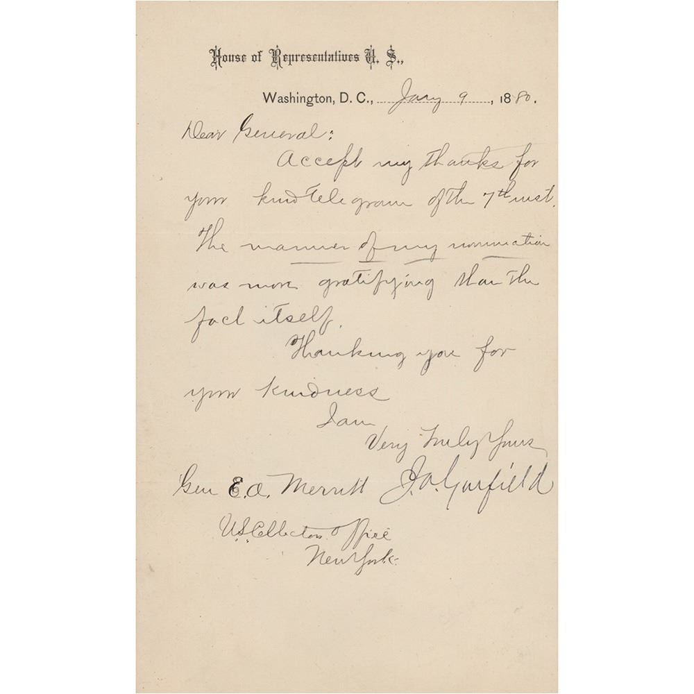 LS signed “J. A. Garfield,” one page, 4.75 x 7.75, House of Representatives letterhead, January 9, 1880. Letter to General E. A. Merritt, in full: "Accept my thanks for your kind telegram of the 7th inst. The manner of my nomination was more gratifying than the fact itself." In very fine condition. Accompanied by a full letter of authenticity and grading from PSA/DNA, evaluating the autograph as "MINT 9."