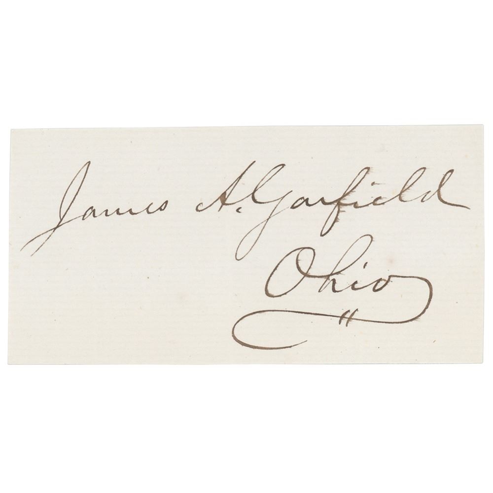 Ink signature, "James A. Garfield, Ohio,†on an off-white 4.25 x 2 sheet. In very fine condition.
