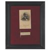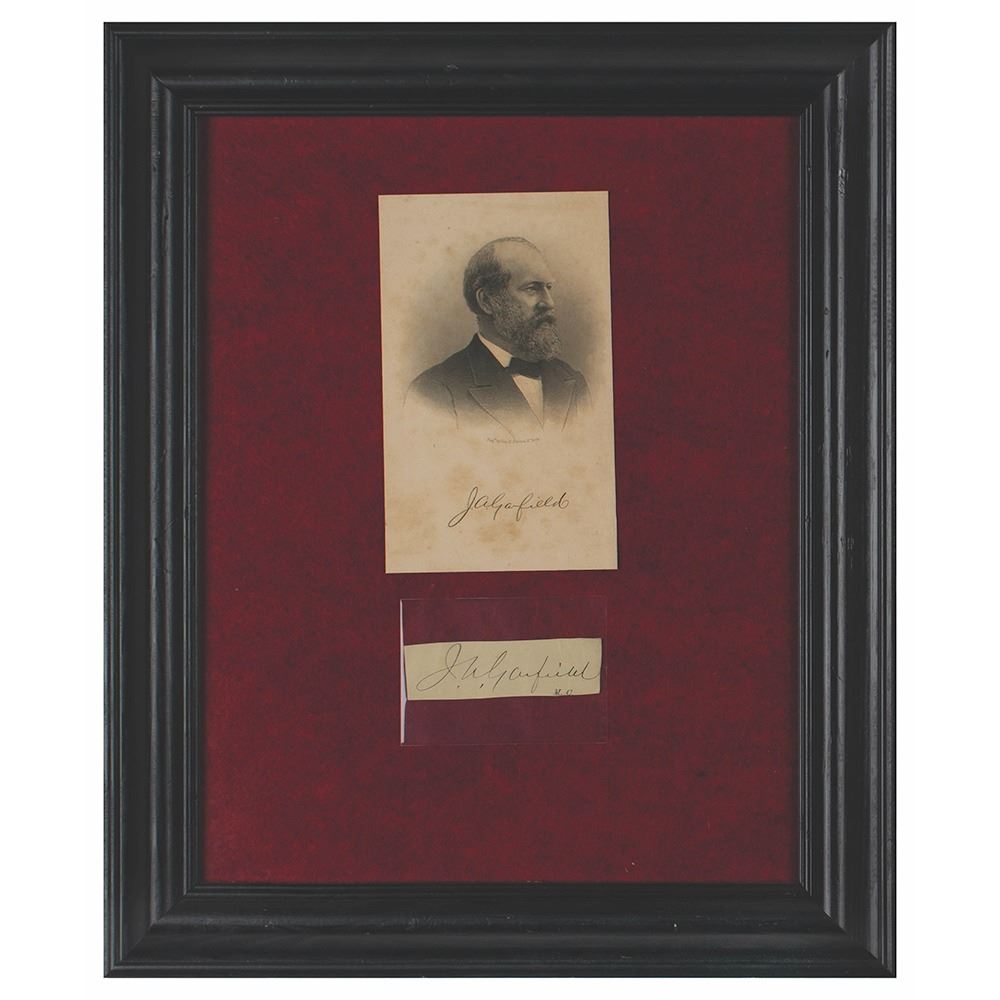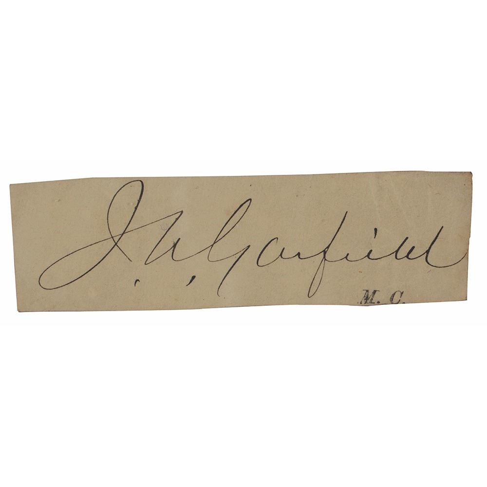 Ink signature, "J. A. Garfield,†on an off-white 3.5 x 1 slip, with "M.C." printed below (signifying 'Member of Congress'). Mounted in a plastic sleeve below an engraved portrait (bearing a facsimile signature) to an overall size of 14 x 17. In very good to fine condition, with light creasing to the right side.