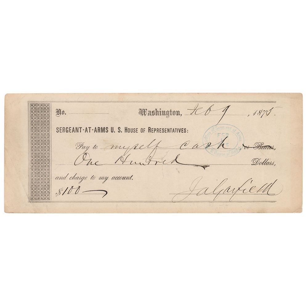 Scarce Sergeant at Arms, United States House of Representatives counter check, 8 x 3.5, filled out and signed by Garfield, "J. A. Garfield," payable to "Myself, Cash" for $100, February 9, 1875. In fine condition, with light edge toning, and a crease to the lower left corner.