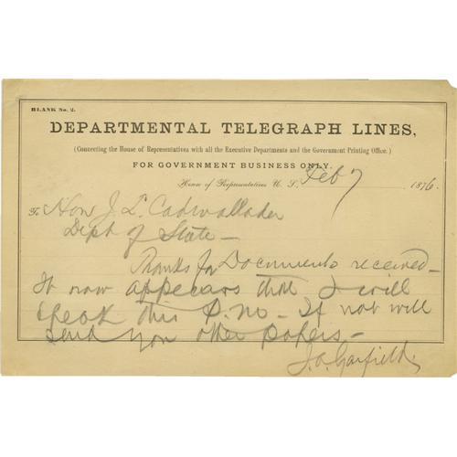 <B>James A. Garfield Telegram Signed</B></I> "<I>J. A. Garfield</B></I>", one page, 8.5" x 5.5", Washington, D.C., February 7, 1876, to John Cadwalder, Department of State. It reads: "Thanks for Documents received. It now appears that I will speak this p.m. - If not will send you the papers." Written in dark pencil - possibly entirely by Garfield - on a Departmental Telegraph Lines form while the future president was serving as a U.S. Representative from Ohio. Overall light toning. Minor loss to two corners. Fine condition.<BR><BR><b>Shipping:</b> Flat Material, Small (<a target="_blank" href="http://www.heritageauctions.com/common/shipping.php">view shipping information</a>)