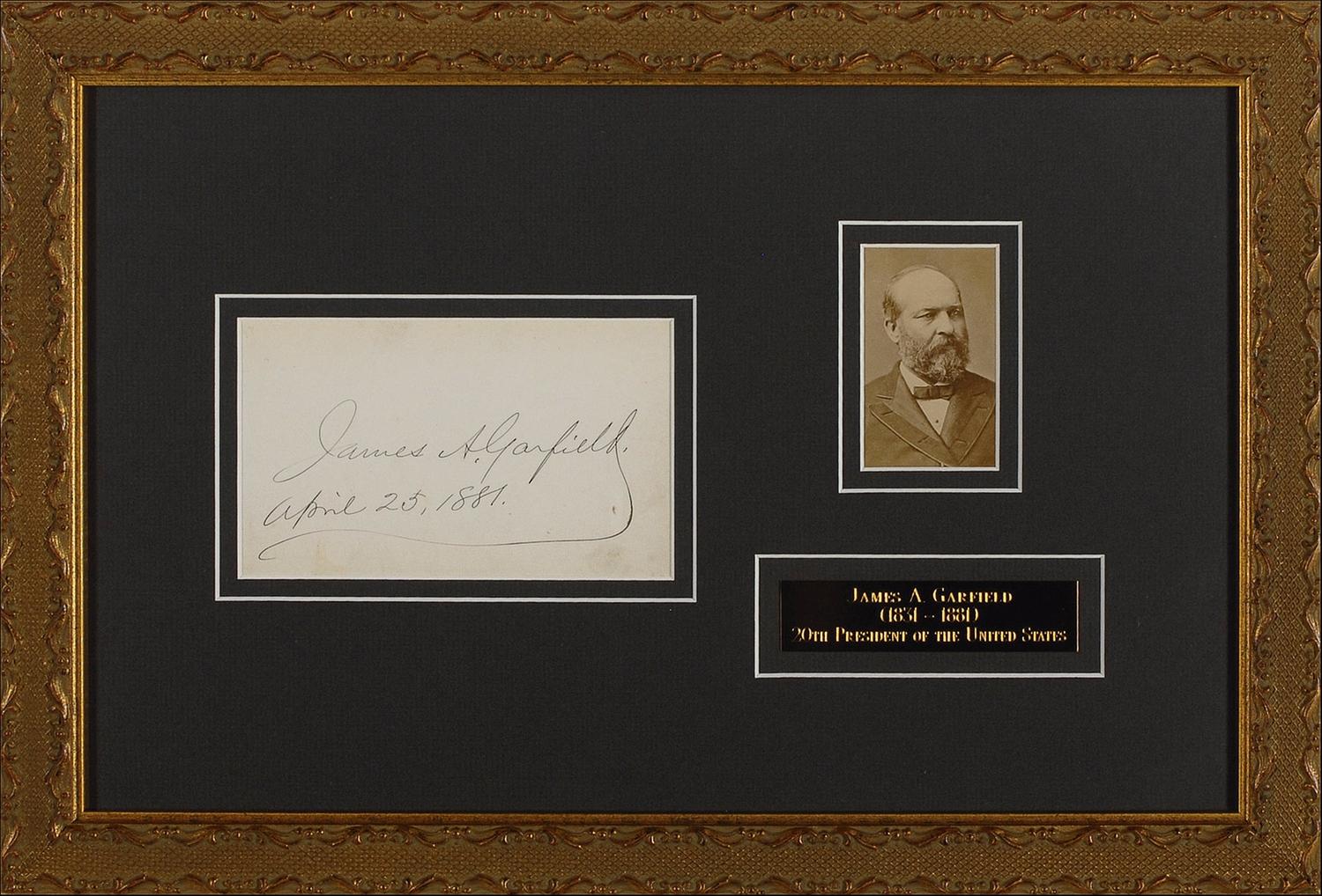 Large and visually impressive ink signature, signed and dated as president, “James A. Garfield, April 25, 1881,” on an off-white 6 x 4 slip. Archivally double matted and framed with a small portrait and a name plaque to an overall size of 19 x 13. In fine condition, with a bit of scattered light toning and soiling. In his 1995 reference History Comes to Life, Kenneth Rendell notes that Garfield “is second only to William Henry Harrison in rarity of signed material during his presidency.” Garfield was evidently feeling the elation of his recent election, as this signature is much larger than most…almost 5.5” in length!