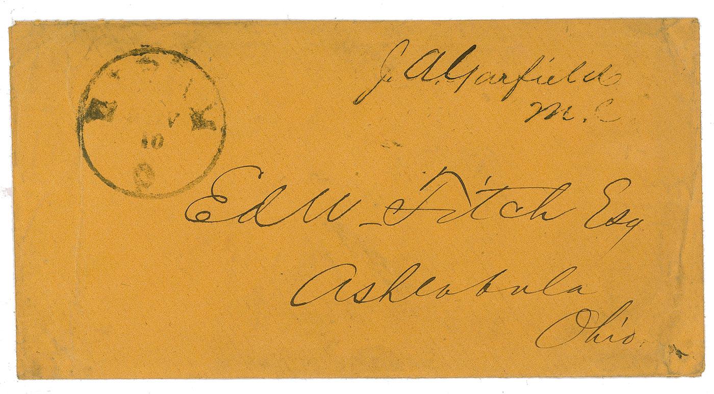 Free-franked envelope, 6.75 x 3.5, addressed in another hand to Edward Fitch in Ashtabula, Ohio, and franked at the top, “J. A. Garfield, mc.” In very good condition, with wrinkling and soiling. Accompanied by several pieces of unsigned Garfield ephemera including a small piece of the hempen matting and black funeral drapery material from Garfield’s funeral, an 1879 and an 1880 pamphlet on Garfield’s speeches, two programs from Garfield memorial services, black-bordered “In Memoriam” card, a small hardcover book honoring the president’s life and death, ten Garfield election tickets, and four unsigned portraits. A remarkable archive, with assassination associaton!