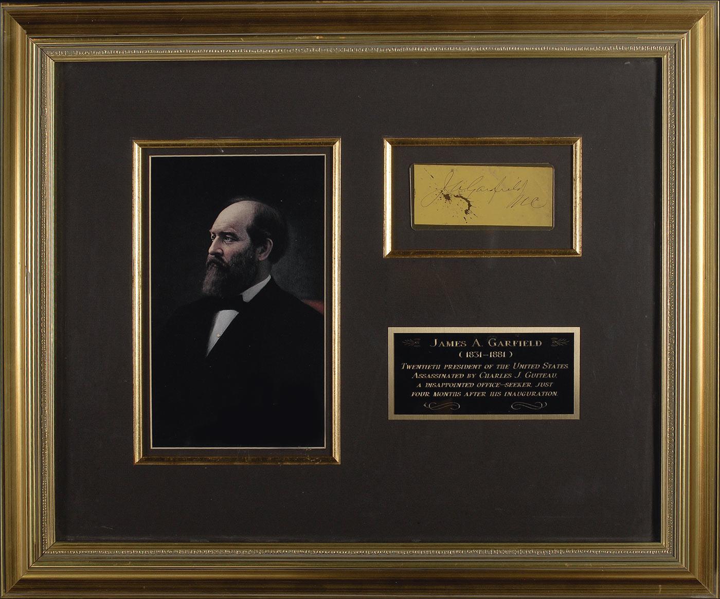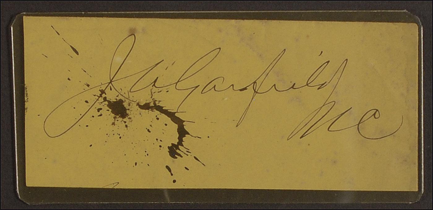 Ink signature, “J. A. Garfield, MC,” on a light yellow 4.5 x 2 slip. Matted and framed with a color portrait and an informational plaque to an overall size of 24 x 20. In very good condition, with scattered soiling, and several ink blotches and flecks, lightly affecting beginning of signature.
