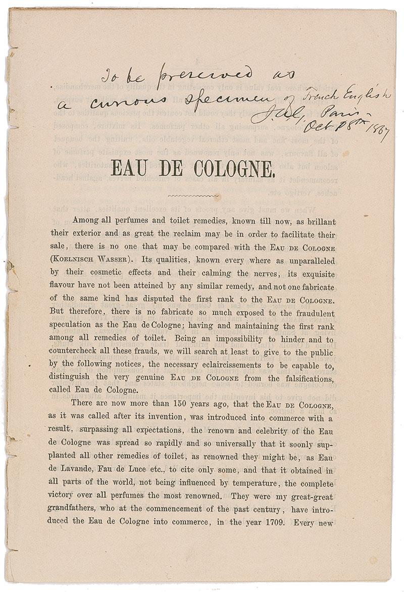 The Paris International Exhibition of 1867 showed perfumes and soaps separate from those available at the nearby pharmacy—thus establishing an independence commercial area for ‘cosmetics.’ Garfield, at the time serving as an Ohio congressman, had visited Paris with his wife as part of a 17-week tour of Europe...making a stop at the aforementioned exhibition along the way. As noted, Garfield found this publication to be “a curious specimen of French English,” particular in the way that the French would translate their verbiage into English, such as ‘Eau de Cologne’ and other phrases. Unique artifact from the personal library of the future 20th president.
