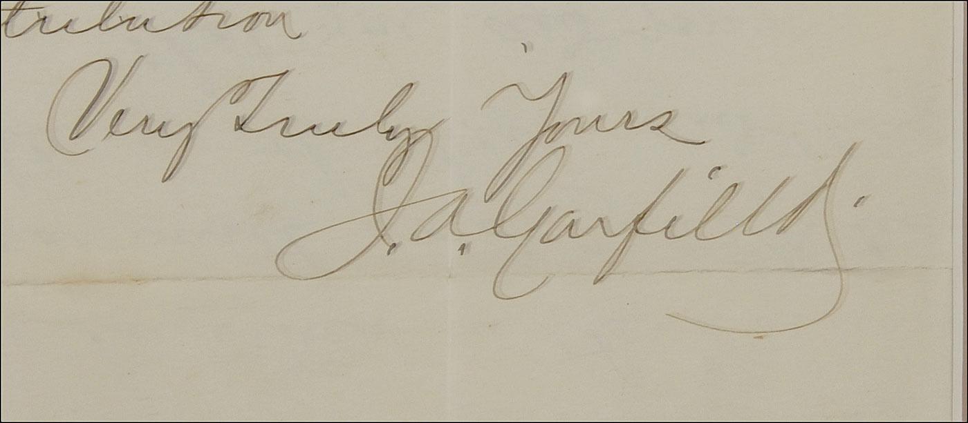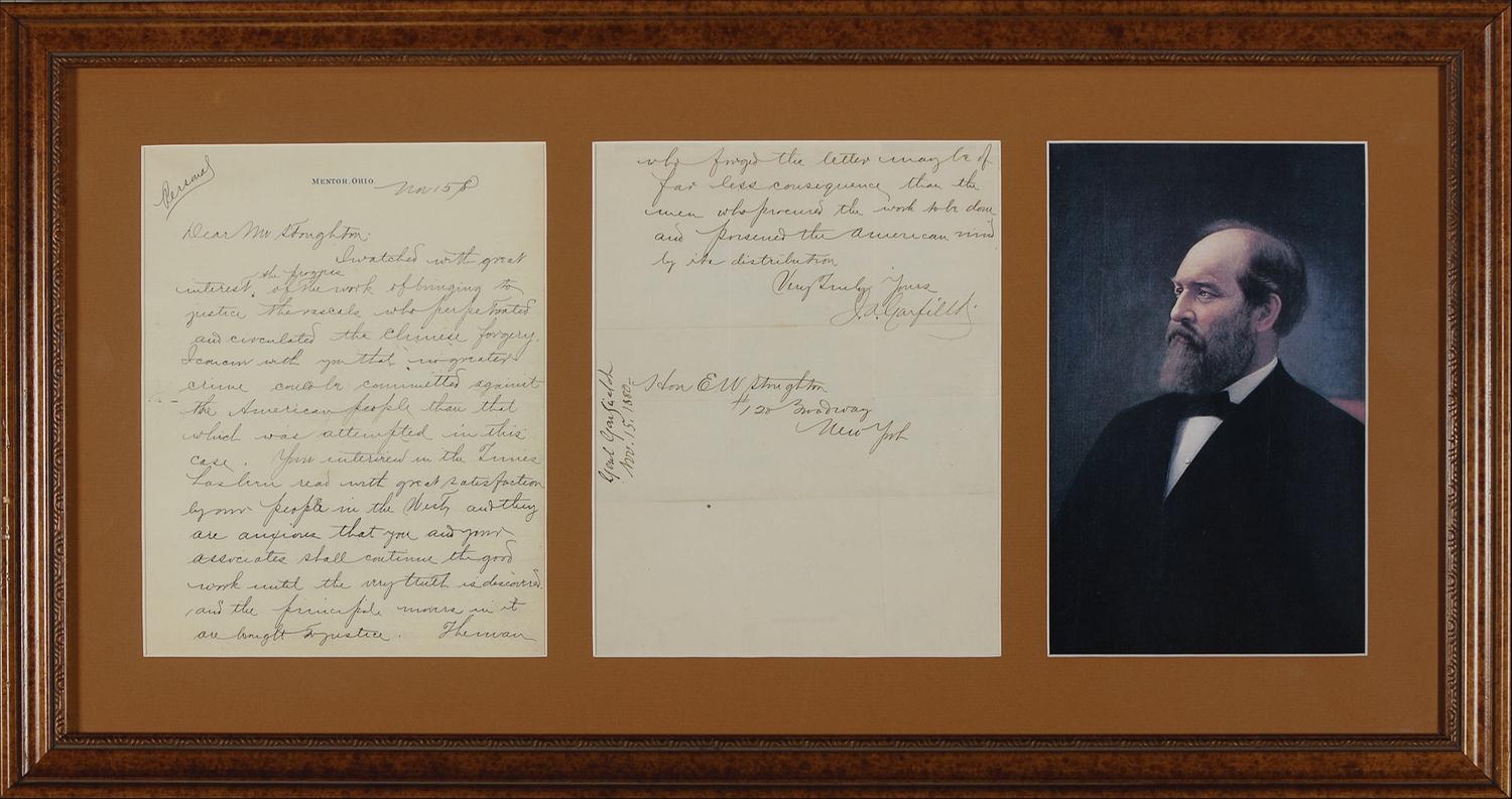 LS as president-elect signed “J. A. Garfield,” one page both sides, 8 x 10, Mentor, Ohio letterhead, November 15, 1880. The newly elected president writes to the Honorable E. W. Stoughton of New York. In full: “I watched with great interest the progress of the work of bringing to justice the rascals who perpetrated and circulated the Chinese forgery. I concur with you that no greater crime could be committed against the American people than that which was attempted in this case. Your interview in the [New York] Times has been read with great satisfaction by our people in the West and they are anxious that you and your associates shall continue the good work until the very truth is discovered, and the principal movers in it are brought to justice. The man who forged the letter may be of far less consequence than the men who procured the work to be done and poisoned the American mind by its distribution.” Matted (secured from the reverse by two pieces of clear tape) with a colorized portrait and photocopy of the first page of the text, with glass on the front and back to allow for viewing of both sides, and framed to an overall size of 29.25 x 15.5. In fine condition, with intersecting folds, one passing horizontally and one vertically through his name.