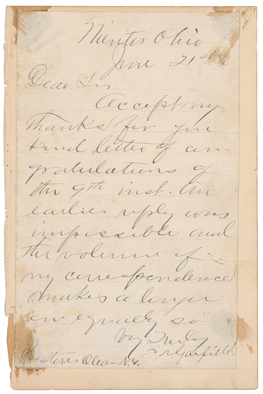ALS signed “J. A. Garfield,” one page, lightly-lined, 5 x 8, June 21, 1880. Letter of thanks to Thomas Stevens. In full: “Accept my thanks for your kind letter of congratulations of the 9th inst. An earlier reply was impossible and the volume of my correspondence makes a longer one equally so.” Letter is affixed to a slightly larger off-white album page. Staining to corners from adhesive on reverse, scattered toning and soiling, Garfield’s signature a bit cramped, and pencil remnants to top left, otherwise very good condition. Garfield, considered a ‘dark horse’ at the Convention, beat out U. S. Grant, who was seeking an unprecedented third term in office.