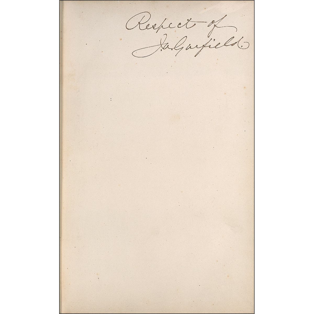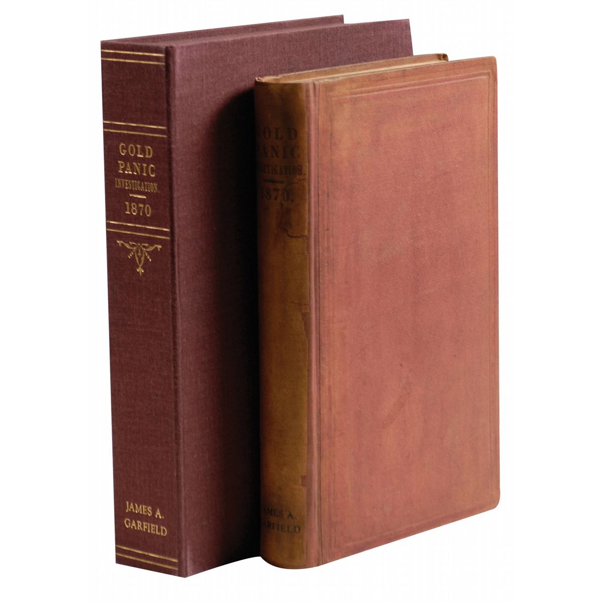 Signed book: Investigation into the Causes of the Gold Panic: Report of the Majority of the Committee on Banking and Currency. Washington, D. C. Government Printing Offic., 1870. Contemporary rebound hardcover, 5.75 x 9, 487 pages. Signed on the first free end page in black ink, “Respects of J. A. Garfield.” In very good condition, with scattered toning and rippling to the pages, and mild staining and soiling to covers, spine, and binding, fading to the spine, and the front hinge a bit weak. The book has been rebacked. Housed in a custom-made cloth covered box with book-like, gilt-lettered spine.