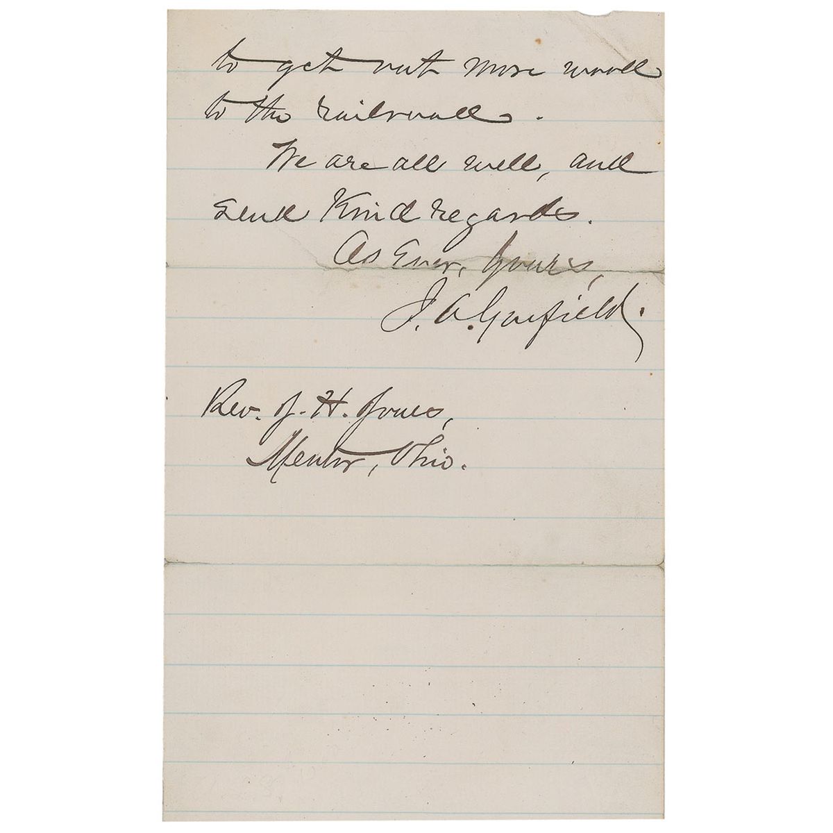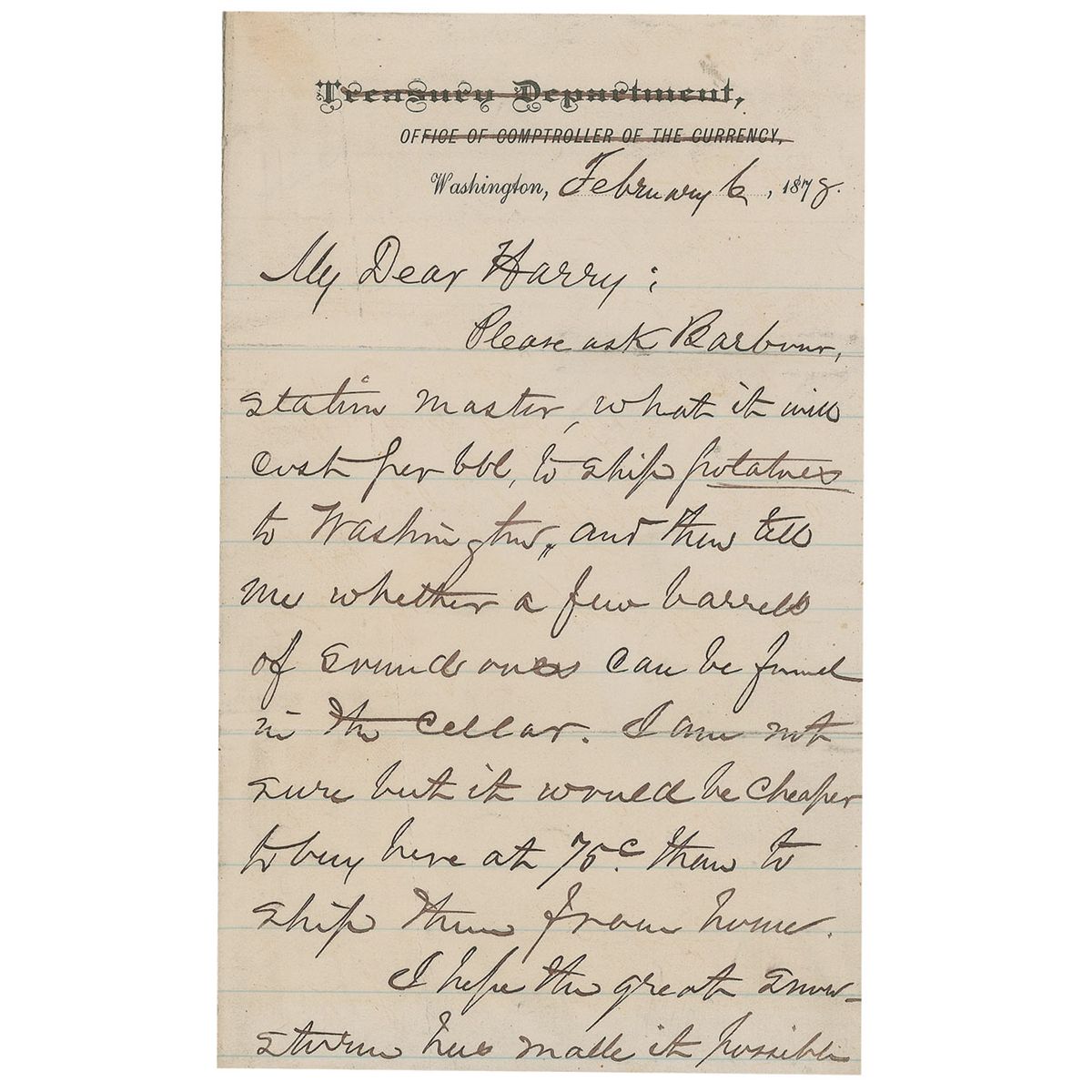 LS signed “J. A. Garfield,” two lightly-lined pages on two adjoining sheets, 5 x 8, crossed-out Treasury Department letterhead, February 6, 1878. Letter to the Rev. J. H. Jones in Ohio concerning shipping potatoes to the Garfield family in Washington. In part: “Please ask Barbour, station master, what it will cost per bbl. to ship potatoes to Washington, and then tell me whether a few barrels of sound ones can be found in the cellar. I am not sure but it would be cheaper to buy here at 75 c. than to ship them from home.” In very good condition, with several repairs to separations and tears, mild toning and soiling, and a diagonal crease to first page of letter.