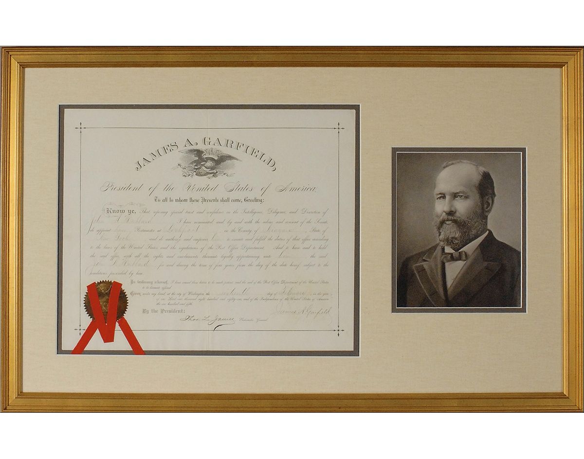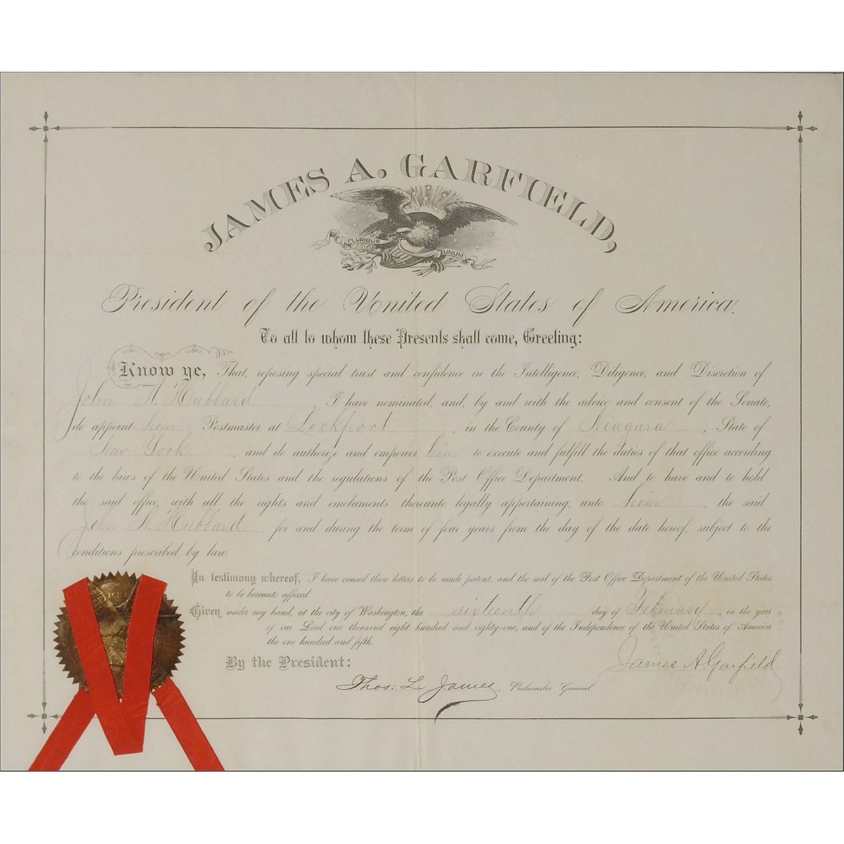 Extremely rare partly-printed DS as president, one page, 17 x 14, February 16, 1881. President Garfield appoints John A. Hubbard to the position of Postmaster of Lockport, New York. Signed at the conclusion in black ink by Garfield, and countersigned by Postmaster General Thomas L. James. Beautifully archivally double cloth matted and framed with a portrait to an overall size of 34 x 21. Intersecting folds, some light toning and mirroring of seal and ribbon to right side of document (a portion of which is over the signature, but does not affect the clarity or legibility at all), and some scattered light creases, otherwise fine condition. The gold foil seal is toned, but intact, and retains its original bright red ribbons.