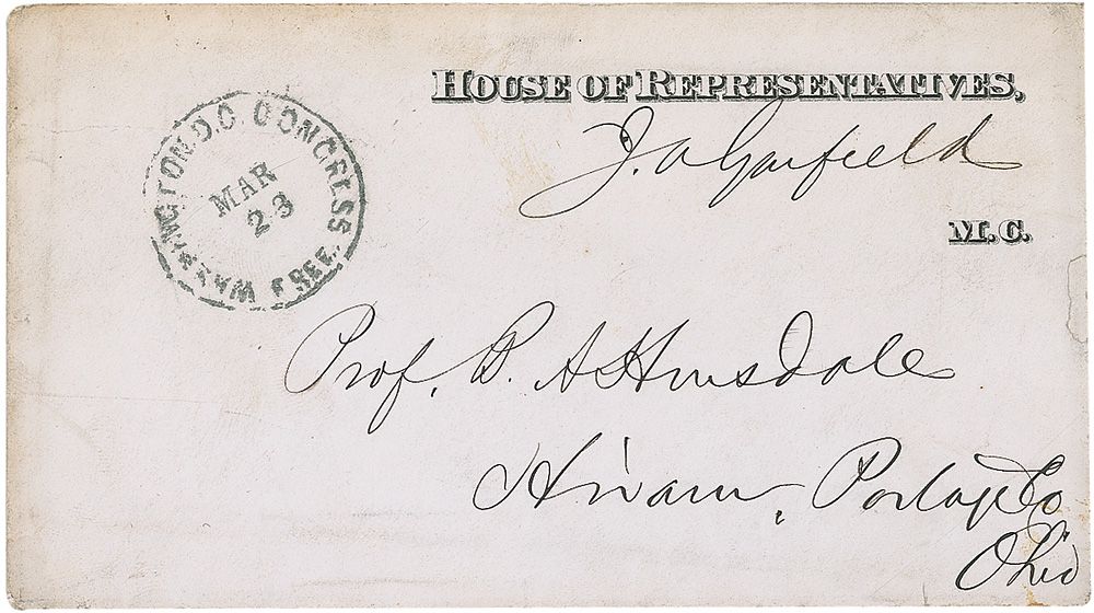 Free franked House of Representatives mailing envelope, 5.75 x 3.25, addressed in Garfield’s hand to “Prof. B. A. Hinsdale, Hiram, Portage Co., Ohio,” and franked near the top, “J. A. Garfield.” Envelope also bears a March 23, congressional postmark. In fine condition, with some scattered light toning, soiling and creasing, and a small chip to right edge.