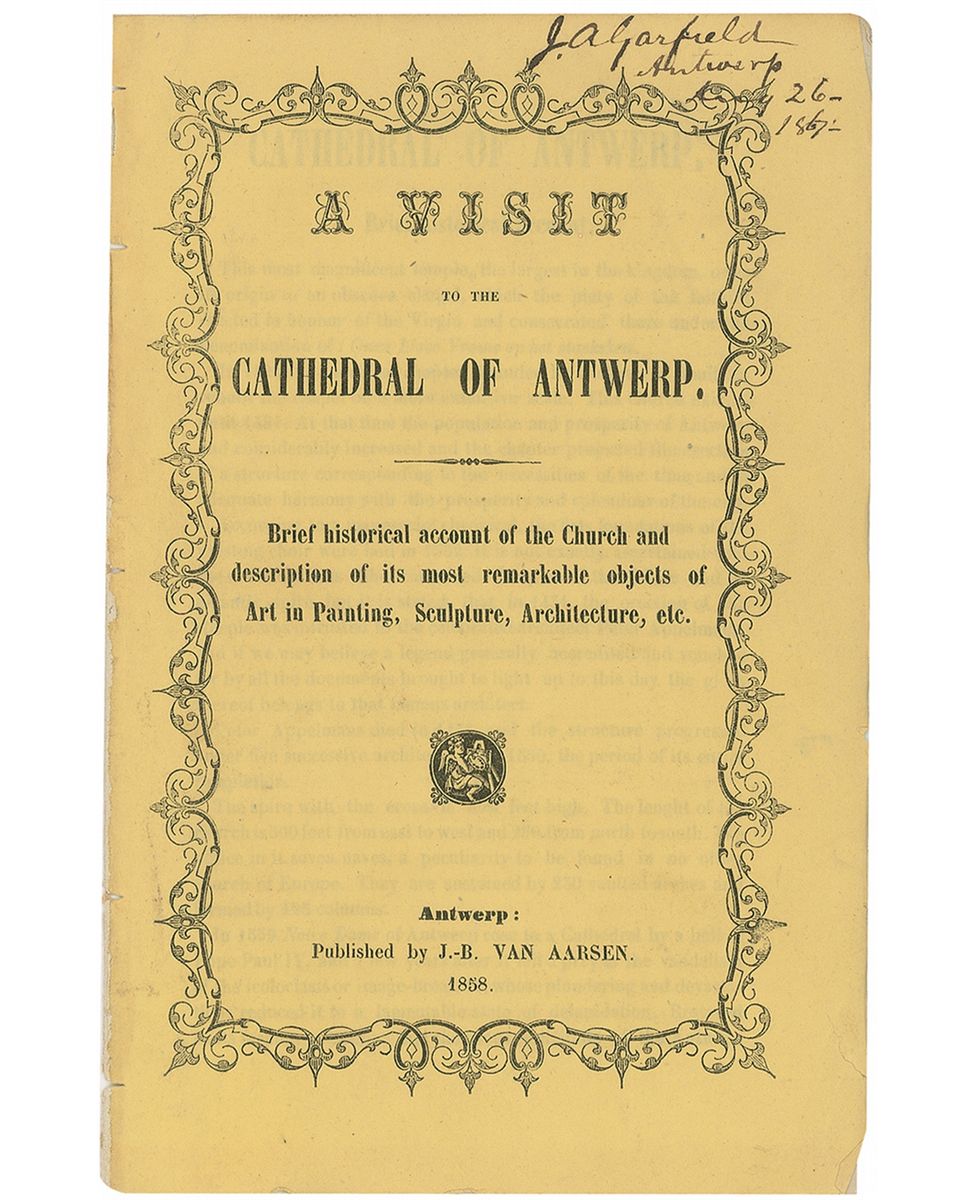 Garfield’s signed personal copy of a booklet entitled “A Visit to the Cathedral of Antwerp,” 5.25 x 8, eight unbound pages, signed on the front cover, “J. A. Garfield, Antwerp Aug 26–1867.” In very good condition, with marginal binding holes to left edge, a light central vertical crease, as well as some scattered light wrinkling and creasing to cover and last page. Garfield was in the midst of another term in Congress, occupied primarily with the Reconstruction, and had traveled to Europe in 1867.