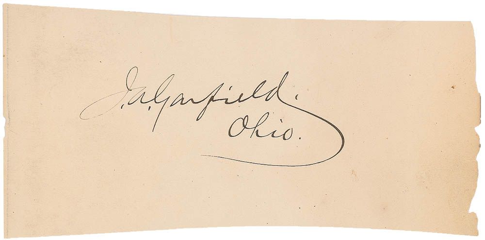 Ink signature, “J. A. Garfield, Ohio,” on an off-white 6.5 x 3 album page. In fine condition, with mild toning to the right side, irregularly trimmed top and bottom edges, and some chipping to the right edge, all of which could be easily matted out.