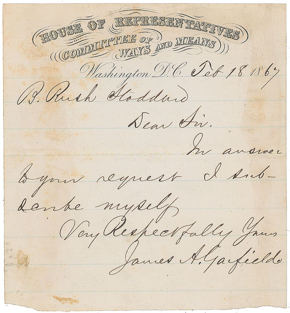 ALS, one page, lightly-lined, 5 x 5.25, House of Representatives letterhead, February 18, 1867. Brief letter complying with a signature request. In full: “In answer to your request I subscribe myself.” In very good condition, with toning and foxing to borders due to adhesive remnants to reverse, and a roughly trimmed bottom edge. A scarce form of Garfield’s signature given that he used this format mostly for official activities during his brief presidential administration.