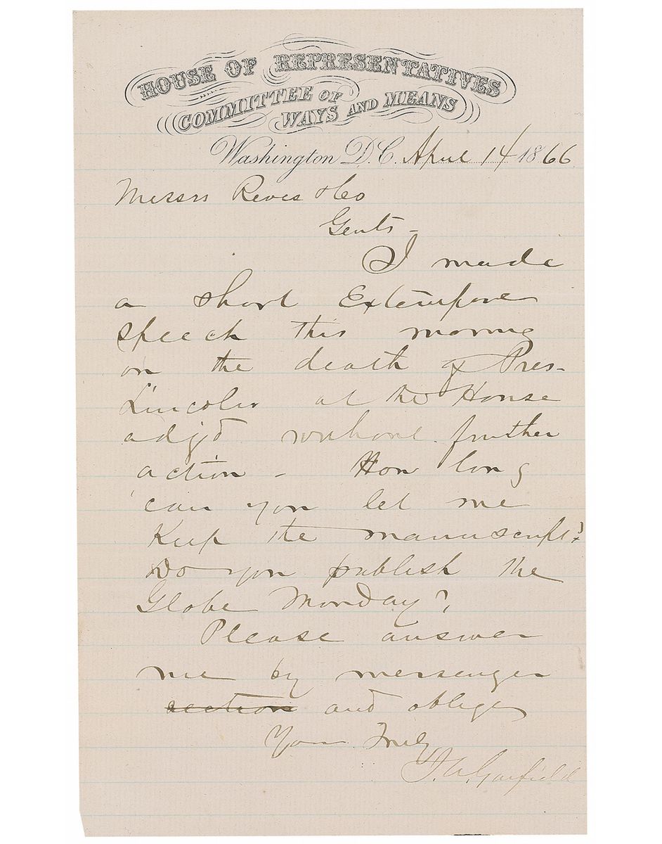 ALS signed “J. A. Garfield,” one page, lightly-lined, 5 x 8, House of Representatives Committee of Ways and Means letterhead, April 14, 1866. Letter to Mr. Reves and Company. In full: “I made a short extemporaneous speech this morning on the death of Pres. Lincoln and the House adjourned without further action. How long can you let me keep the manuscript? Do you publish the Globe Monday? Please answer me by messenger.” In fine condition, with Garfield’s signature a couple shades light due to decreased ink flow, but still completely legible. Accompanied by an engraved portrait. A rare association piece between two assassinated presidents.