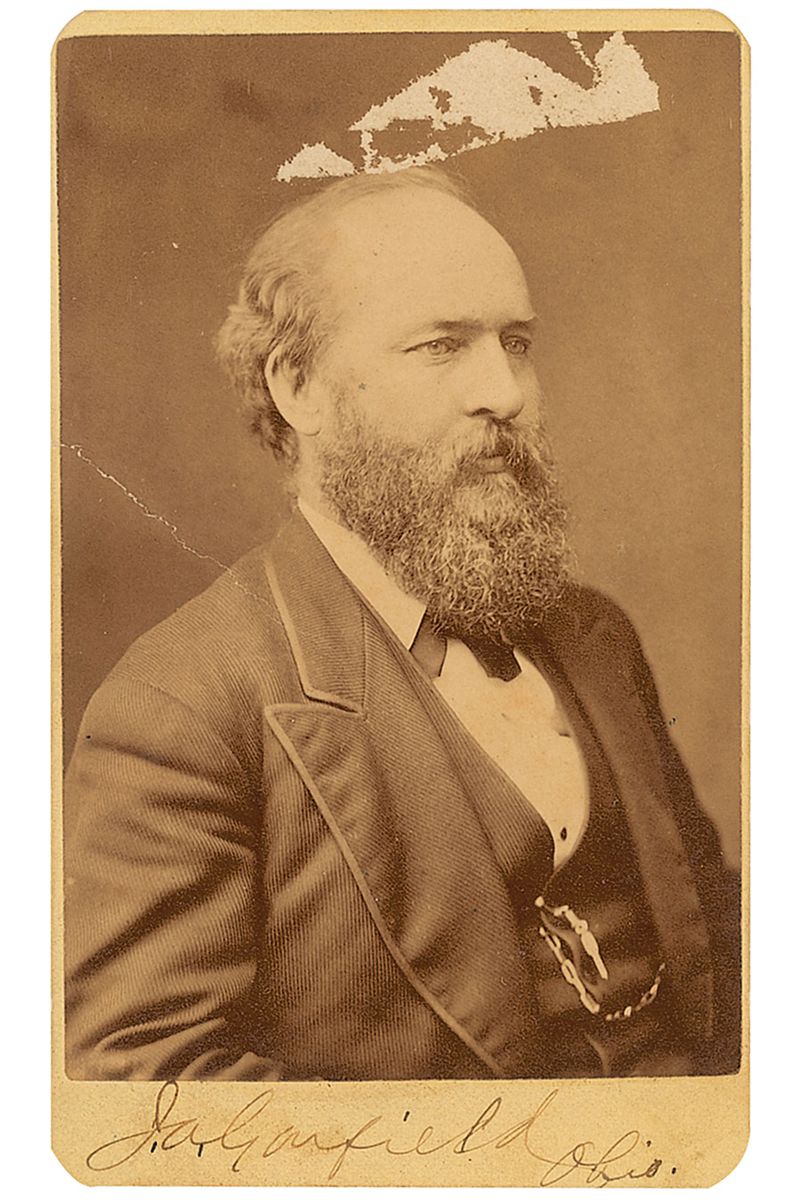 Original 2.5 x 4.25 carte-de-visite portrait by L. M. Price of Warren, Ohio, signed in the lower border in black ink, “J. A. Garfield, Ohio.” A notation to the reverse in another hand reads, “Fr. Gen. Garfield, Feb. 12, 1876.” In very good condition, with a diagonal crease to the left side and an area of surface loss to the top, which hardly distract from the crystal-clear image and neat signature. Garfield is quite rare in signed photos of any type, and this is one of only two cartes-de-visite we have offered.