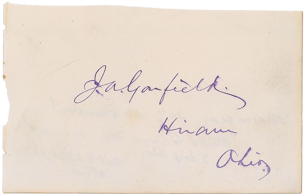 Ink signature, “J. A. Garfield, Hiram, Ohio,” on an off-white 4.75 x 3 sheet. In fine condition.