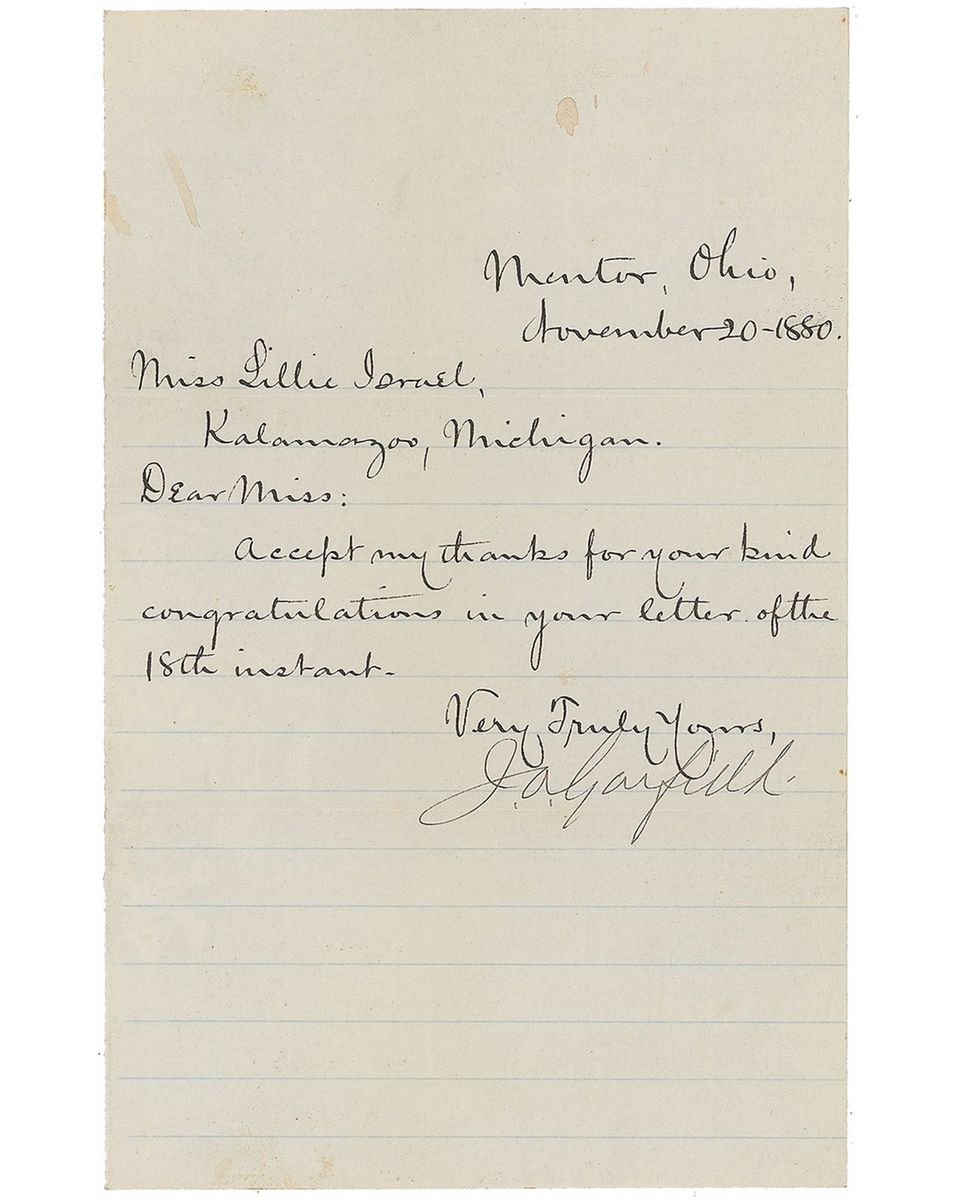LS as president-elect, signed “J. A. Garfield,” one page, lightly-lined, 5 x 8, November 20, 1880. Letter to a supporter. In full: “Accept my thanks for your kind congratulations in your letter of the 18th instant.” In fine condition, with some slight staining to the top. Accompanied by the original mailing envelope. Garfield had just won the 1880 presidential election on November 2, and this letter is most likely a response to someone wishing him well in the nation’s highest office.