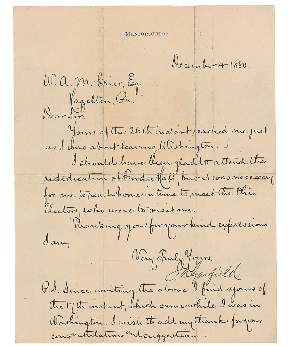 LS as president-elect signed “J. A. Garfield,” one page, lightly-lined, 8 x 10.25, personal letterhead, December 4, 1880. Letter to W. A. M. Grier, Esq. In full: “Yours of the 26th instant reached me just as I was about leaving Washington. I should have been glad to attend the rededication of Pardee Hall, but it was necessary for me to reach home in time to meet the Ohio Electors, who were to visit me. Thanking you for your kind expressions.” A postscript added to the bottom reads “P.S. Since writing the above I find yours of the 17th instant, which came while I was in Washington. I wish to add my thanks for your congratulations and suggestions.” In very good condition, with small separations along intersecting folds, two passing though single letters of the signature, professional repairs to reverse of folds, and some mild toning.